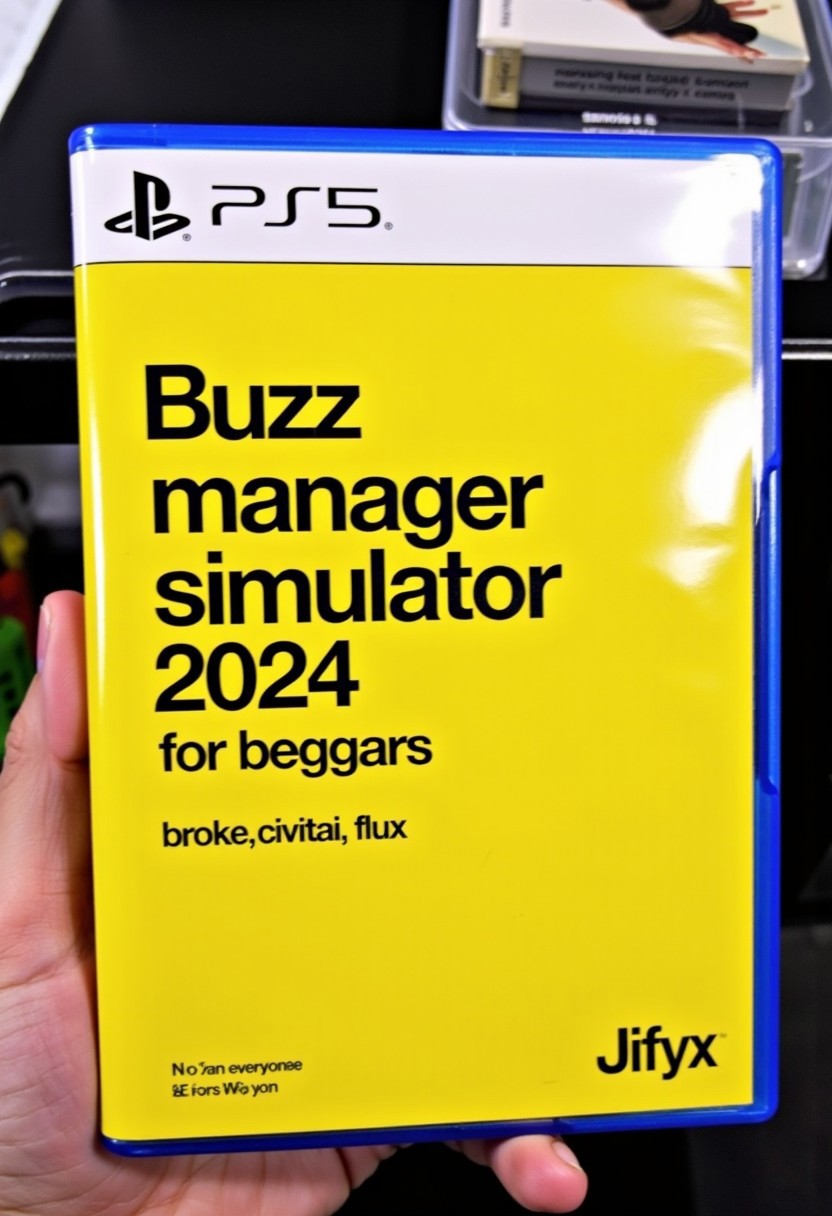 This is a photograph of Playstation 5 video game case in a game store. The case label design has a bright yellow background, displaying a minimalist design. The case features prominent black bold text "Buzz manager simulator 2024," with smaller text below that says "for beggars". Below is a bullet list of features: "broke", "civitai," and "flux". The game is rated E for everyone. The brand name "Jifyx" is printed in the bottom right corner. <lora:No_Name_Brand_Products_FLUX-000001:1>
