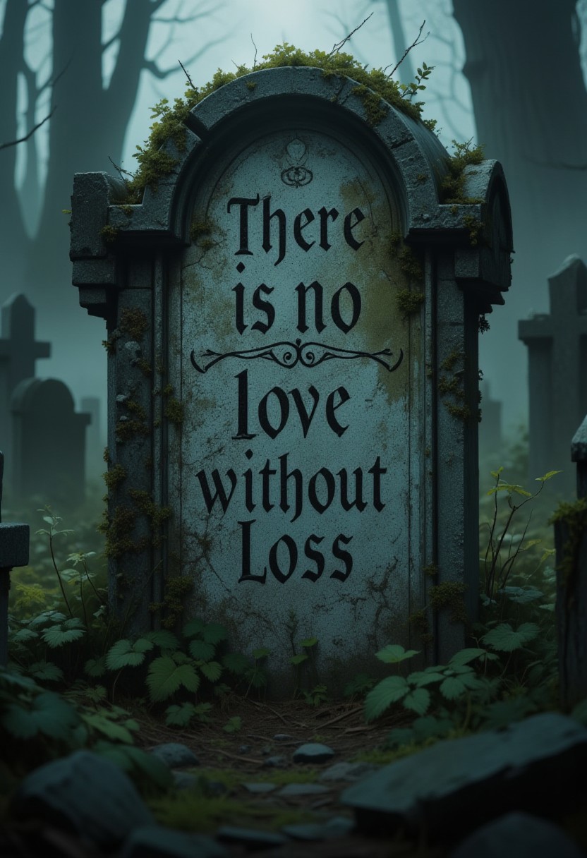 This hyper realistic anime oil painting image shows the front of a tombstone in a graveyard. The focus of the image is on the tombstone and what it has carved into it. The chiseled engravings on the tombstone, weathered by time, read in classic gothic font: "There is no love without loss", decorated with appropriate somber flouish. The texture of the stone is rough and uneven with some areas showing signs of erosion or damage. ,limited palette, low key, moody lighting, high-quality, masterpiece, style is modern, atmospheric, high detail, (hyperdetailed:1.1), (intricate details:1.0), (Refined details:1.1), (best quality:1.1), (high resolution:1.2), by David Hamilton and April Gornik and Caspar David Friedrich and John William Godward and Anna Dittman, cinematic, featured on Artstation, extremely detailed, octane render, 4k, 8k, HD, concept art, drkfnts style, stylized animated film scene, aidmaHyperrealism,