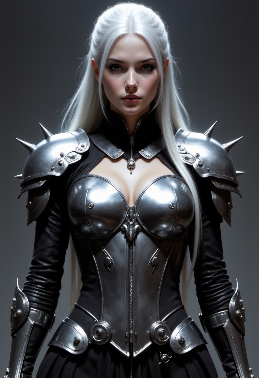 Minimalist vector art illustration of Masterpiece (3D, 4K PS5 Graphics, Unreal Engine 5, Goth Princess In Plate Armor with Spiked Pauldrons, Long Silver Hair, Sinister Smile), UHD, HDR, 8K, Extremely Detailed, Bio Luminescent, Ultra Realistic