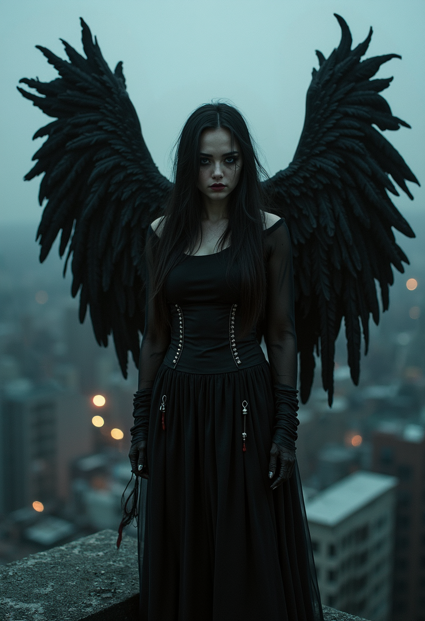 A female emo angel, with jet-black wings tinged with hints of crimson, stands atop a desolate, urban rooftop. Their melancholic gaze pierces through the darkness, reflecting the pain and turmoil of the world below. Tattered black feathers cascade around them, swirling in the cold, night air. The cityscape stretches out behind, a labyrinth of shadows and flickering neon lights. Rendered in a blend of Gothic and Photographic styles, capturing the raw emotion and gritty realism of the scene. The image is bathed in moody, atmospheric lighting, casting dramatic shadows across the angel's solemn expression.<lora:ImageUpgraderV2:0.5> detailmaximizer