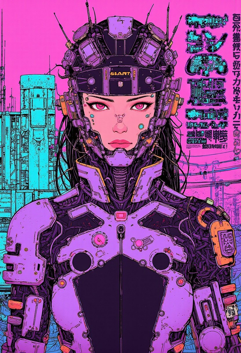 anime poster image featuring a cyborg female warrior wearing cyb3rwar3, posing for the camera with a cyberpunk city backdrop, in the style of cybermono_style. The image is vibrant and intense