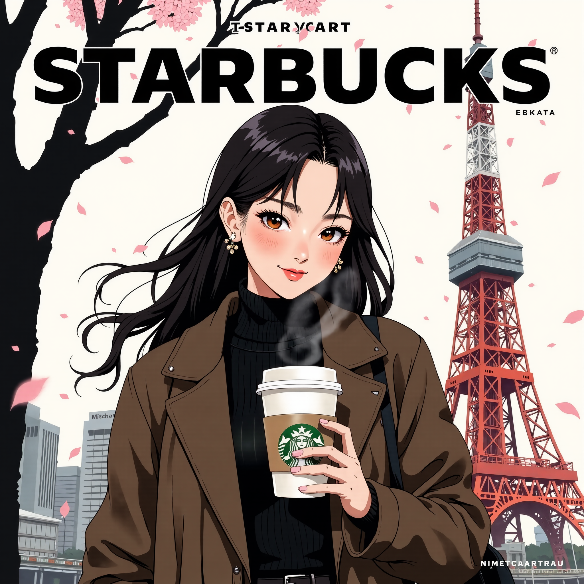 anime_martz, magazine_style, mythp0rt, magazine_cover, fashion cover for starbucks, A stylish urban woman, dressed impeccably in winter fashion, stands under the iconic Tokyo Tower on a crisp winter day. She cradles a steaming cup of Starbucks coffee, the Starbucks logo prominently displayed on the cupâs sleeve. Her expression radiates happiness and warmth, her smile soft and carefree as she enjoys the moment. The backdrop of Tokyo Tower, dusted with winterâs chill, adds a touch of urban sophistication to the scene. The overall vibe is cozy yet fashionable, with the cold season juxtaposed against the warmth of her drink and the chic city setting. The Starbucks logo and brand name take center stage as the magazineâs title, integrating seamlessly with the fashionable design of the cover, emphasizing the connection between style, urban living, and the comforting indulgence of a hot coffee<lora:anime_martz:0.9> <lora:magazine_cover2_flux:0.6> <lora:FluxMythP0rtr4itStyle:0.4> <lora:Halftone_Flux:0.3>