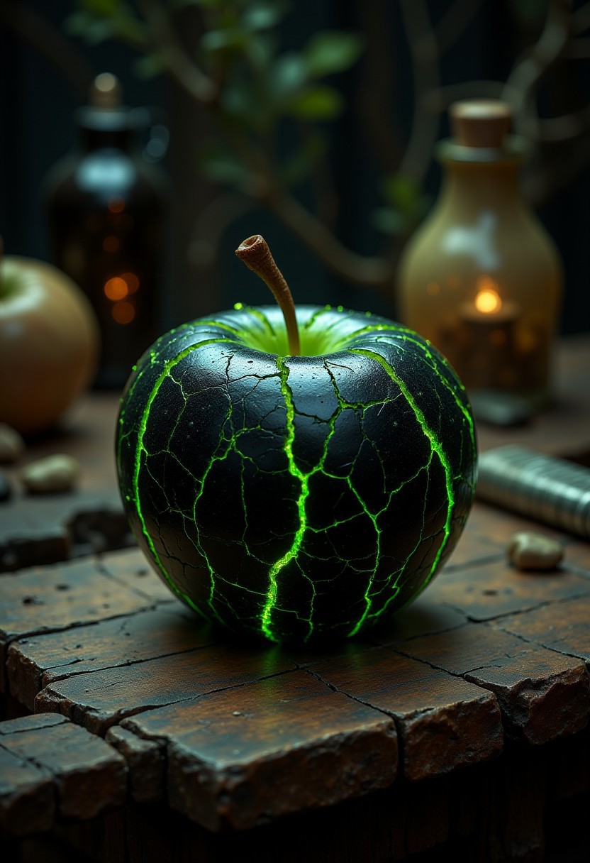 green cracks on black, elaborate apple, on an old wodden table, surrounded by magical supplies
