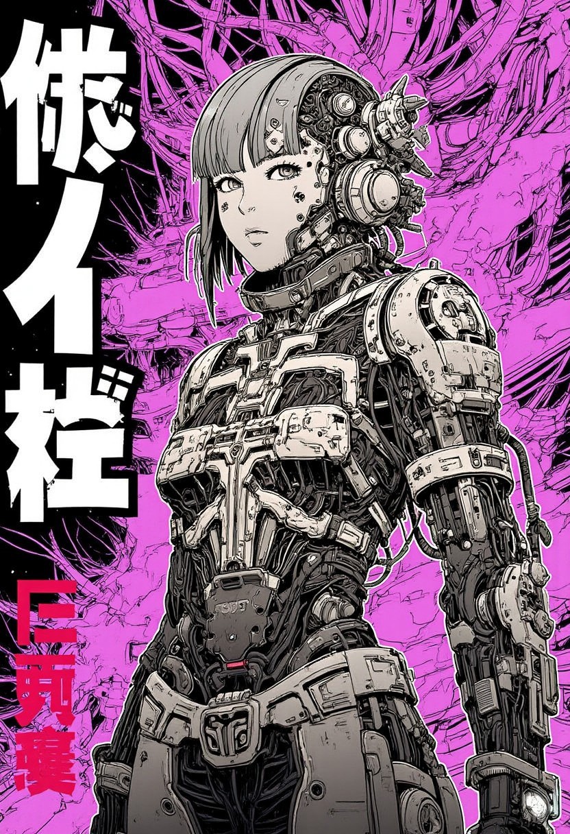 anime poster image featuring a cyborg female warrior wearing cyb3rwar3, posing for the camera with a cyberpunk city backdrop, in the style of cybermono_style. The image is vibrant and intense