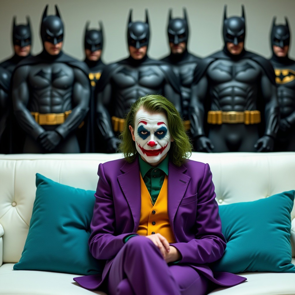 macro, close up, face focus, photograph close up photo of a Joker from Batman wearing purple suit sitting on a couch, 5 Batmans standing behind the couch in Batman suits looking at the woman, sharp focus, polaroid, studio photo, HDR, UHD, 128K, highly detailed, concept, selective focus, sharp focus, intricate details, face focus, white couch, two aquamarine pillows to the left and to the right of Joker