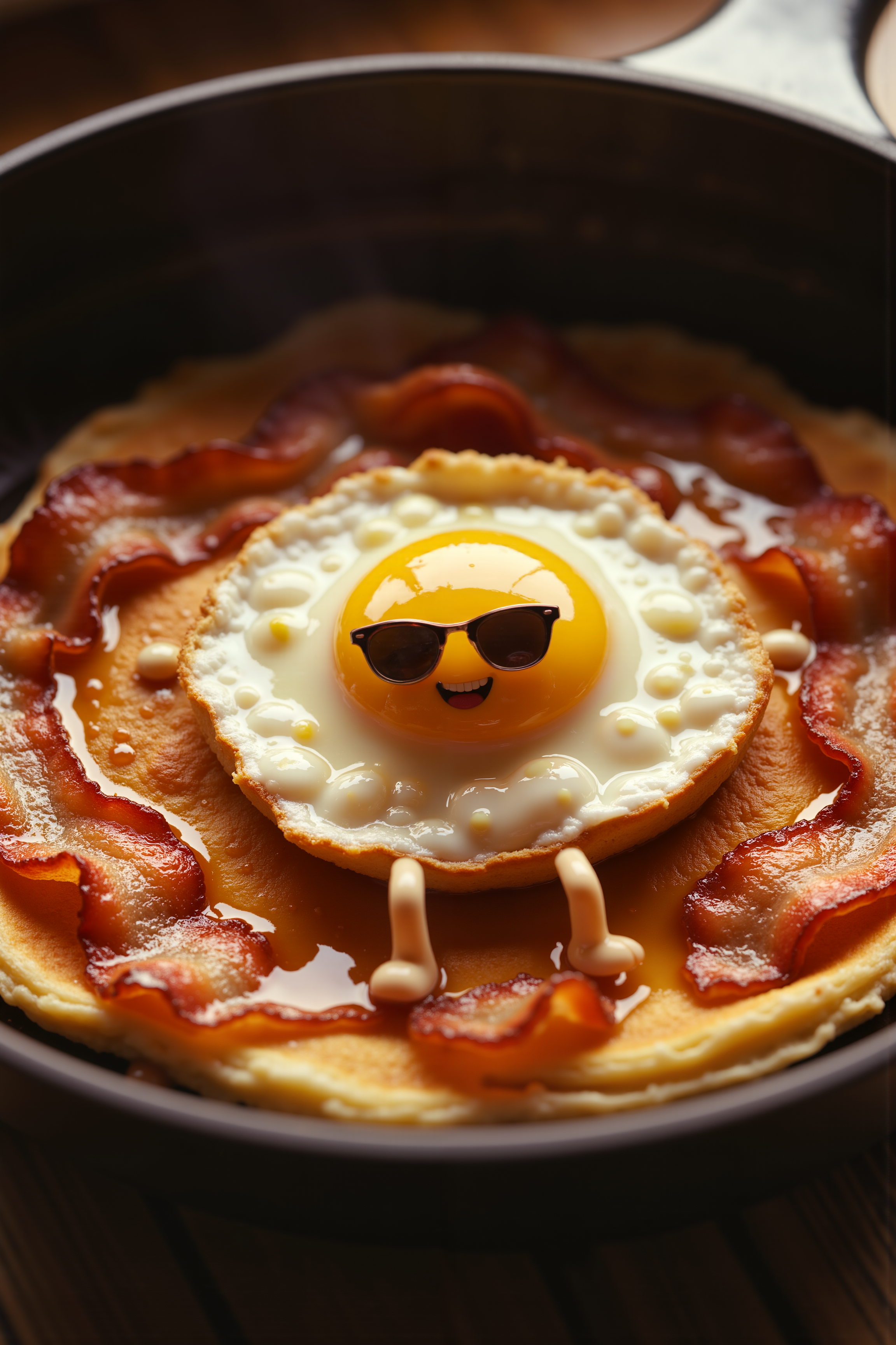 Analog photo, Kodak Ektachrome 100 vibe, macro close-up aerial view, a smiling fried egg with tiny legs and sunglasses, dancing on a skillet-shaped stage made of pancakes, while sizzling bacon strips groove in the background, inspired by Adventure Time and Lisa Frank, maple syrup rivers flowing around the stage, vibrant tones, cinematic morning sunlight with glossy breakfast textures, fun and quirky.<lora:aidmaMJ6.1-FLUX-V0.1:0.6><lora:Movie_Portrait><lora:Flux DetailerV2>