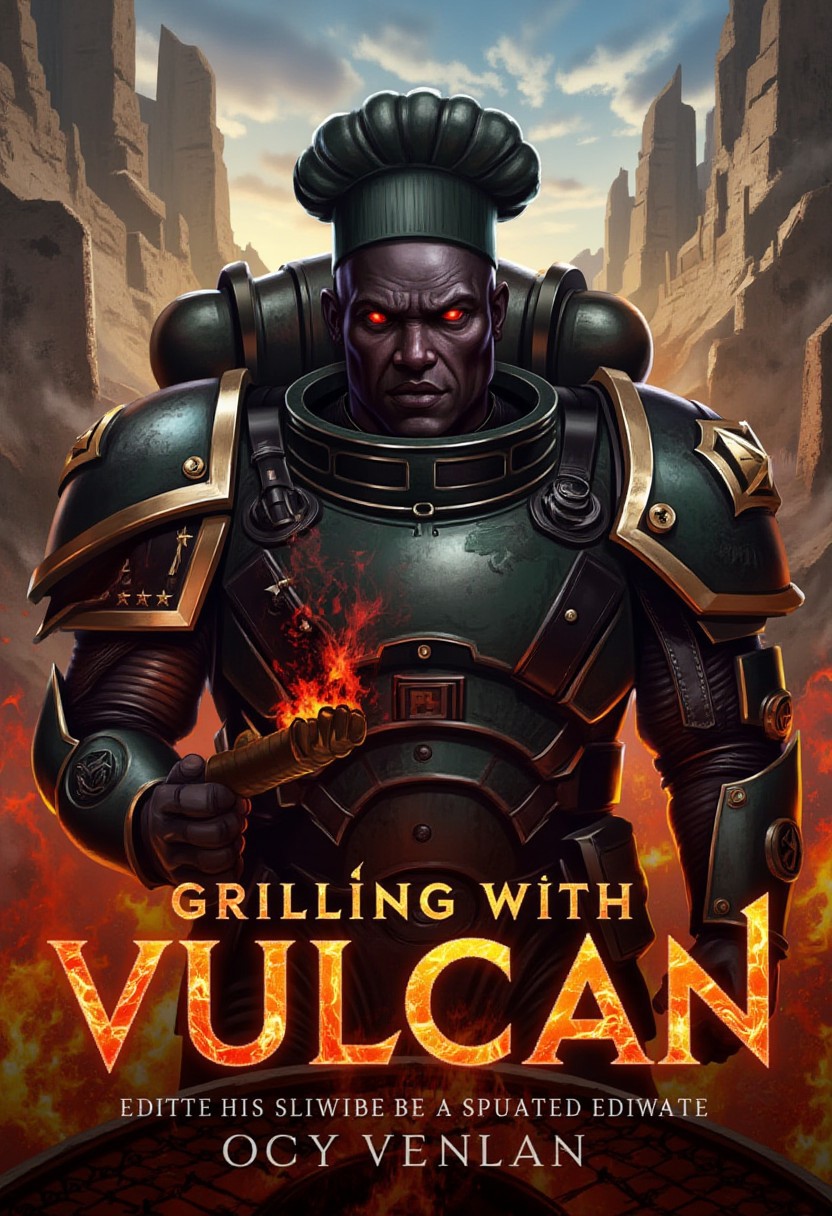 book_cover, title "Grilling with Vulcan", written by Vulcan, outdoors, BBQ grill, slmndr, space marine, armor,black skin, red eyes, chef hat , ultra detailed, intricate details, sci-fi,