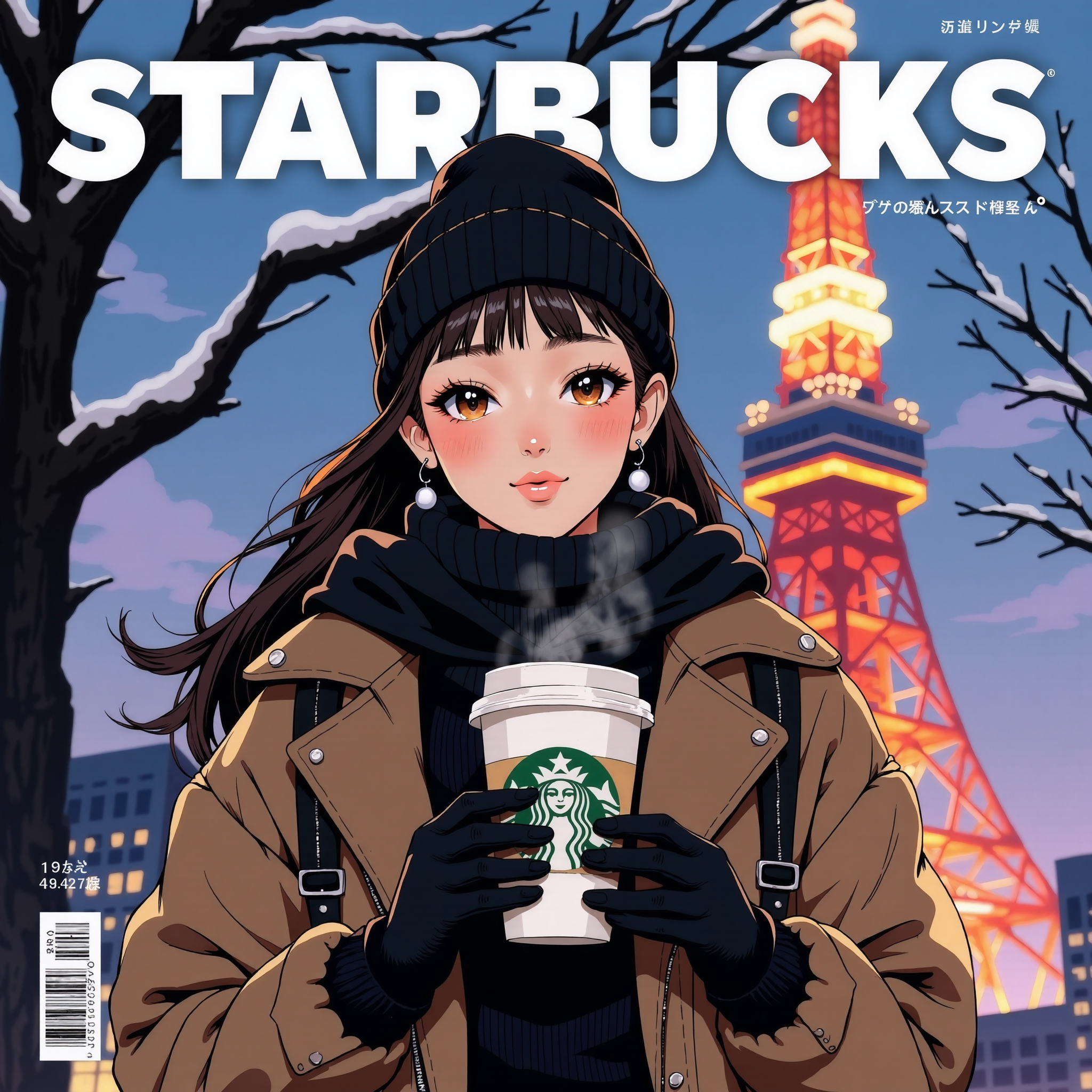 anime_martz, magazine_style, mythp0rt, magazine_cover, fashion cover for starbucks, A stylish urban woman, dressed impeccably in winter fashion, stands under the iconic Tokyo Tower on a crisp winter day. She cradles a steaming cup of Starbucks coffee, the Starbucks logo prominently displayed on the cupâs sleeve. Her expression radiates happiness and warmth, her smile soft and carefree as she enjoys the moment. The backdrop of Tokyo Tower, dusted with winterâs chill, adds a touch of urban sophistication to the scene. The overall vibe is cozy yet fashionable, with the cold season juxtaposed against the warmth of her drink and the chic city setting. The Starbucks logo and brand name take center stage as the magazineâs title, integrating seamlessly with the fashionable design of the cover, emphasizing the connection between style, urban living, and the comforting indulgence of a hot coffee<lora:anime_martz:0.9> <lora:magazine_cover2_flux:0.6> <lora:FluxMythP0rtr4itStyle:0.4> <lora:Halftone_Flux:0.3>