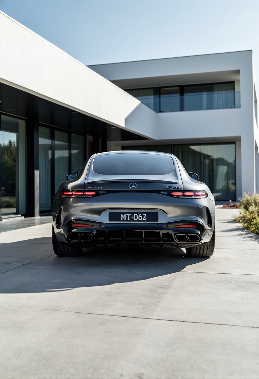 A high-resolution shot of the AMG GT 63 parked in front of a minimalist modern house with large glass windows. The polished, futuristic architecture mirrors the carâs sleek and modern design. The car is perfectly centered in the frame, showing off its luxury and status in an elite, contemporary setting. Rear view with slightly side view, professional car ad.