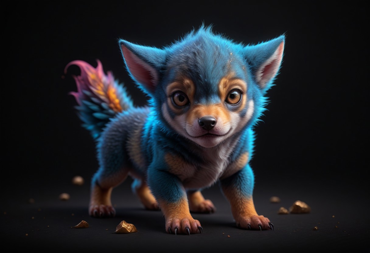 CBCHIMER4, cute baby chimera, vibrant color, a wolf, Best quality, 4k, Extremely detailed hyper realistic. DARK BACKGROUND