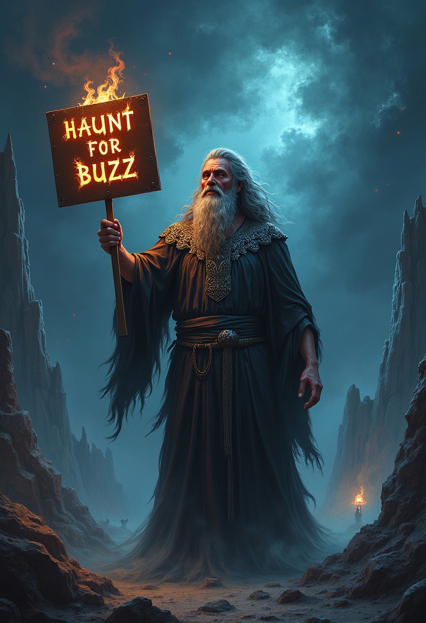 The scene depicts Hades, the Greek god of the underworld, standing in a shadowy, ethereal realm. He is dressed in dark, flowing robes adorned with intricate silver patterns that glimmer ominously in the dim light. His expression is a mix of mischief and curiosity, with a slight smirk playing on his lips as he gazes at the viewer. In one hand, he holds a sign that reads "WILL HAUNT FOR BUZZ” in a bold, stylized font, surrounded by eerie, flickering flames. The background features a landscape of jagged rocks and swirling mist, punctuated by glimpses of lost souls wandering aimlessly. Ghostly figures float around him, looking both intrigued and bewildered by Hades' unusual request. Above him, the sky is a swirling mass of deep blues and purples, dotted with stars that twinkle like distant spirits. The overall atmosphere combines a dark humor with the fantastical, inviting viewers to imagine the underworld's ruler seeking a thrilling experience, contrasting his typical domain of death and despair with a lighthearted plea for excitement.