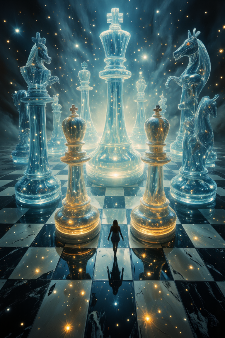 A surreal, otherworldly scene set on an enormous chessboard with intricate black and white squares that stretch across the horizon. Towering, translucent crystal chess pieces dominate the landscape, each radiating with tiny, glowing particles that pulse with a mysterious light. The chess piecesâKings, Queens, Knights, Bishops, Pawns, and Horsesâare all semi-transparent, their towering forms glowing softly in hues of blue and gold. They loom over the scene, their presence majestic yet eerie. Among these massive chess pieces, a lone woman wanders, lost and disoriented, her figure dwarfed by the gigantic glowing entities around her. Her every movement hints at confusion, as she cautiously navigates through the maze of radiant chess pieces. The background is softly blurred, creating a dreamlike, otherworldly atmosphere that enhances the feeling of isolation and displacement. The scene is depicted with high contrast, vibrant colors, and ultra-detailed textures, giving a sense of hyper-realism. The soft glow of the chess pieces and the delicate play of light and shadow create a rich, immersive visual experience, balancing the surreal beauty with an underlying sense of unease. <lora:ImageUpgraderV2:0.6> detailmaximizer <lora:MidjourneyV6.1:0.6> midjourneyv6.1 <lora:aidmaGLOWV4wc:0.5> aidmaGlow <lora:zavy-drkcnmtc-fxl:0.6> zavy-drkcnmtc <lora:Space-flux:0.6> noc-space