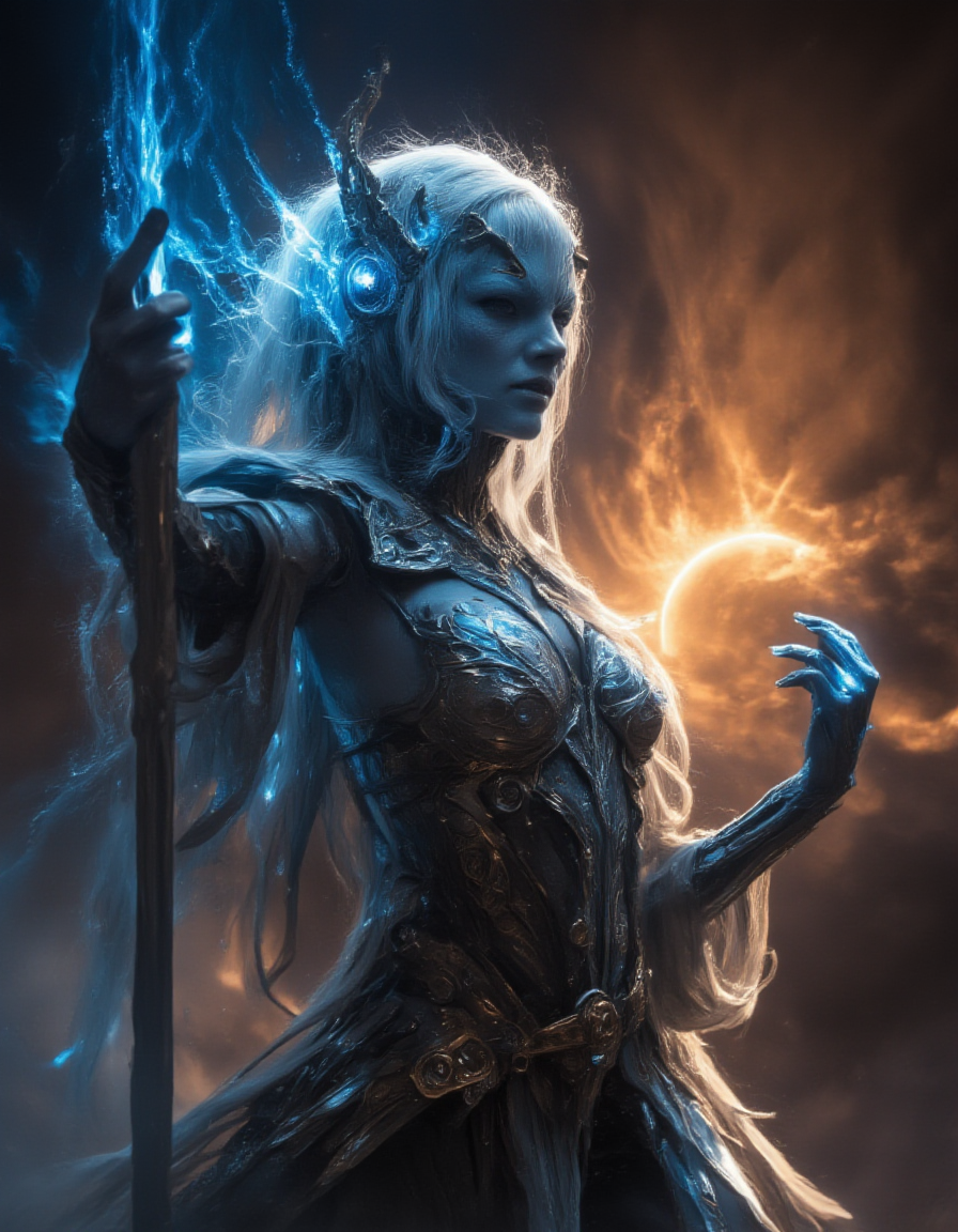 fantasy style portrait photo. The elf wizard raises hers magic staff and a tornado of plasma envelops her body. She has white hair and dark skin. She has a bob cut. She wears contemporary clothing.<lora:FantasyWizardWitchesFluxV2-000001:0.9> hkmagic. sharp focus, bokeh. <lora:artilands:0.75> <lora:artisketchyfs-v02:0.25> <lora:Bourdoir:0.75> <lora:aidmaHyperrealism:0.75> aidmaHyperrealism <lora:- Flux1 - vanta_black_V2.0:1> vantablack