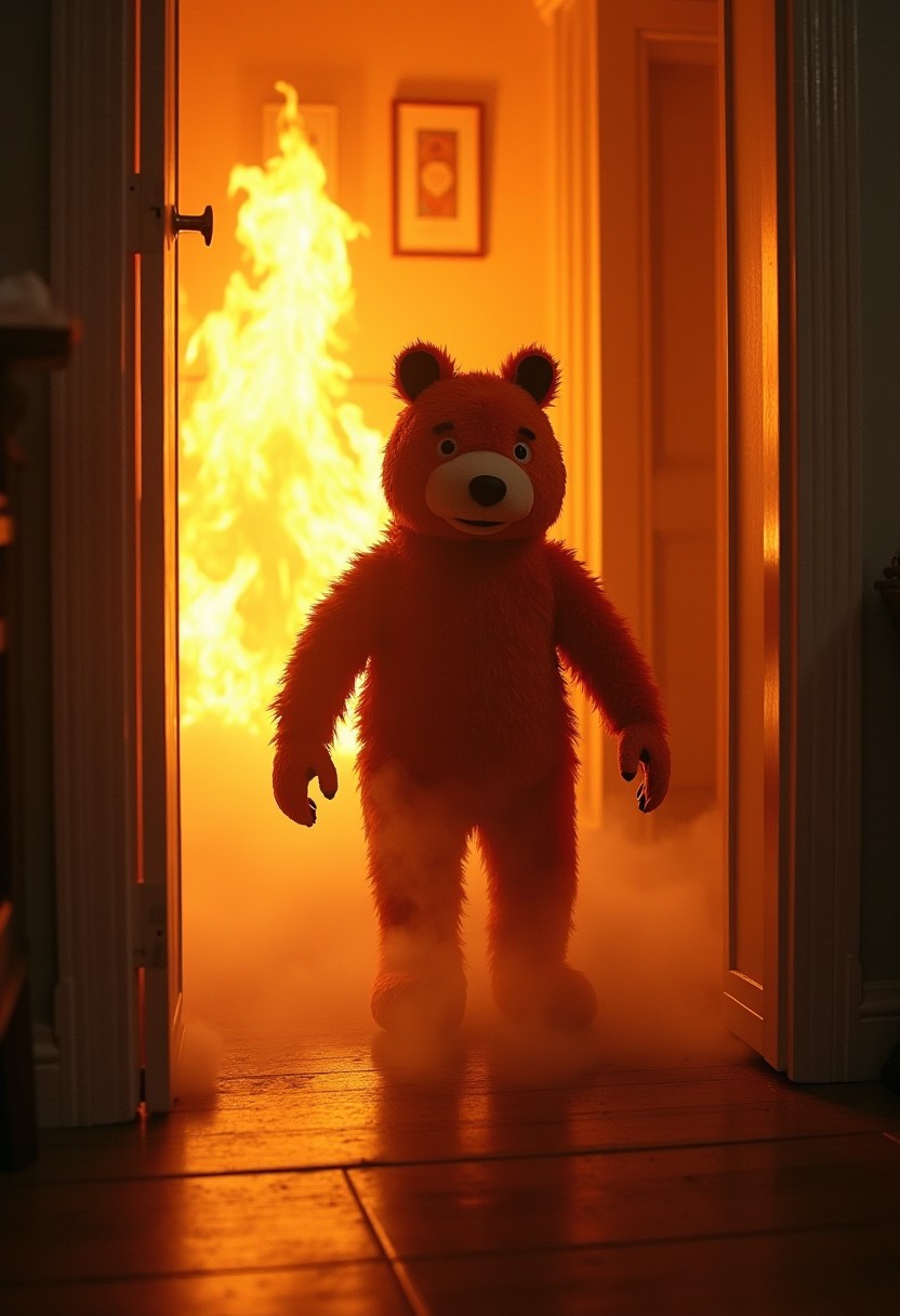 anthropomorphic fire is escaping from the house, and a fire broke out in the room behind it,
