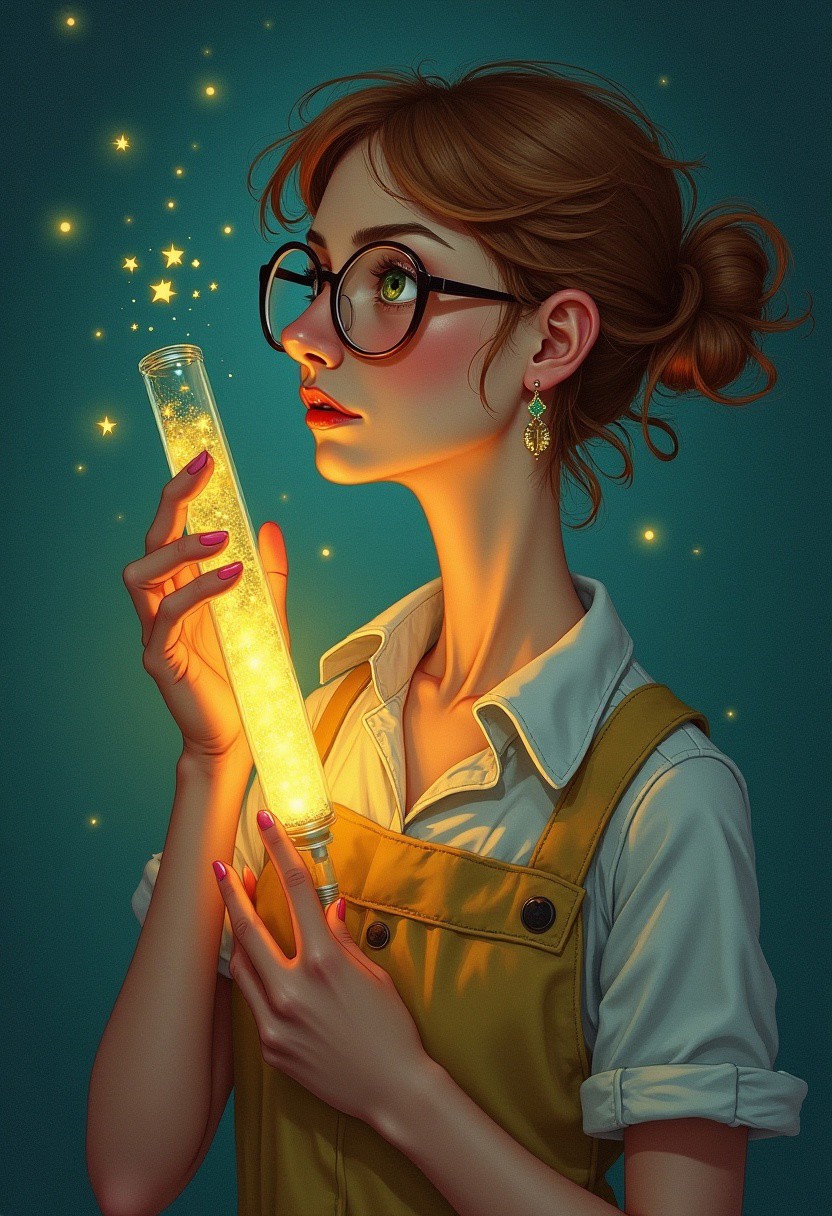Th inventor holds a test tube up to the light, portrait, whimsical, anime meets contemporary impressionism, in the style of Anna Dittmann