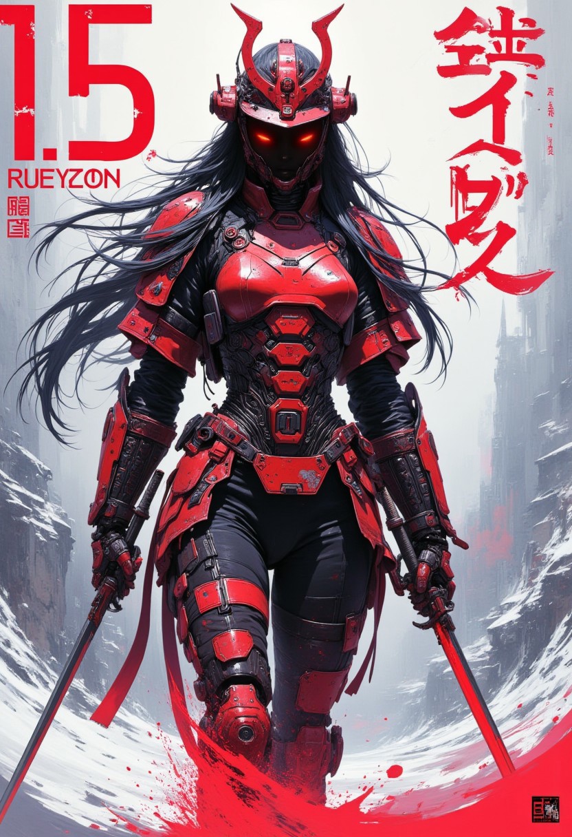 cyberpunk anime style, a stunning japanese female warrior, long flowing hair, wearing samurai armour and helmet, holding a katana with both hands on a snowy battlefield, theme in neon, red and black colour, high quality, highly detailed