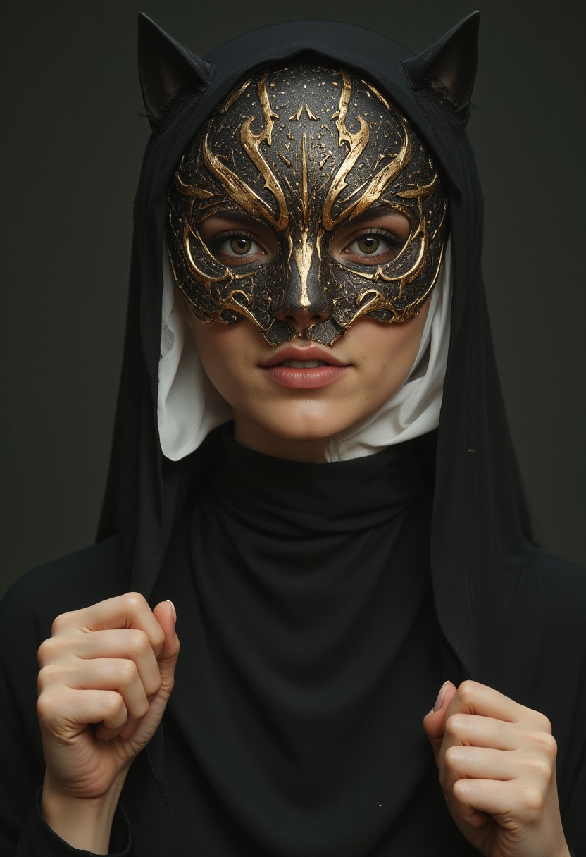 S1n0z1ck style, extreme Closeup of a beautiful nun in a traditional nun’s habit, but wearing a old egypt iron mask. The mask shows intricate, Sci-fi details with sharp edges and deep relief. The lighting is cinematic, casting deep shadows on her face, emphasizing the dark nature of the mask. Hyperrealistic extreme closeup, capturing every fine detail with insane clarity, shot with a 64 megapixel DSLR in a vintage atmosphere. Detailed skin, detailed photorealistic eyes, volumetric lighting, cat-pose, both of her hands are raised in front of her face, clenched into fists, adding a dynamic edge to her posture. Standing amidst a Desert storm in the Heat of the dunes, floating particles, photorealistic, atmospheric lighting, volumetric Sand Clouds,
