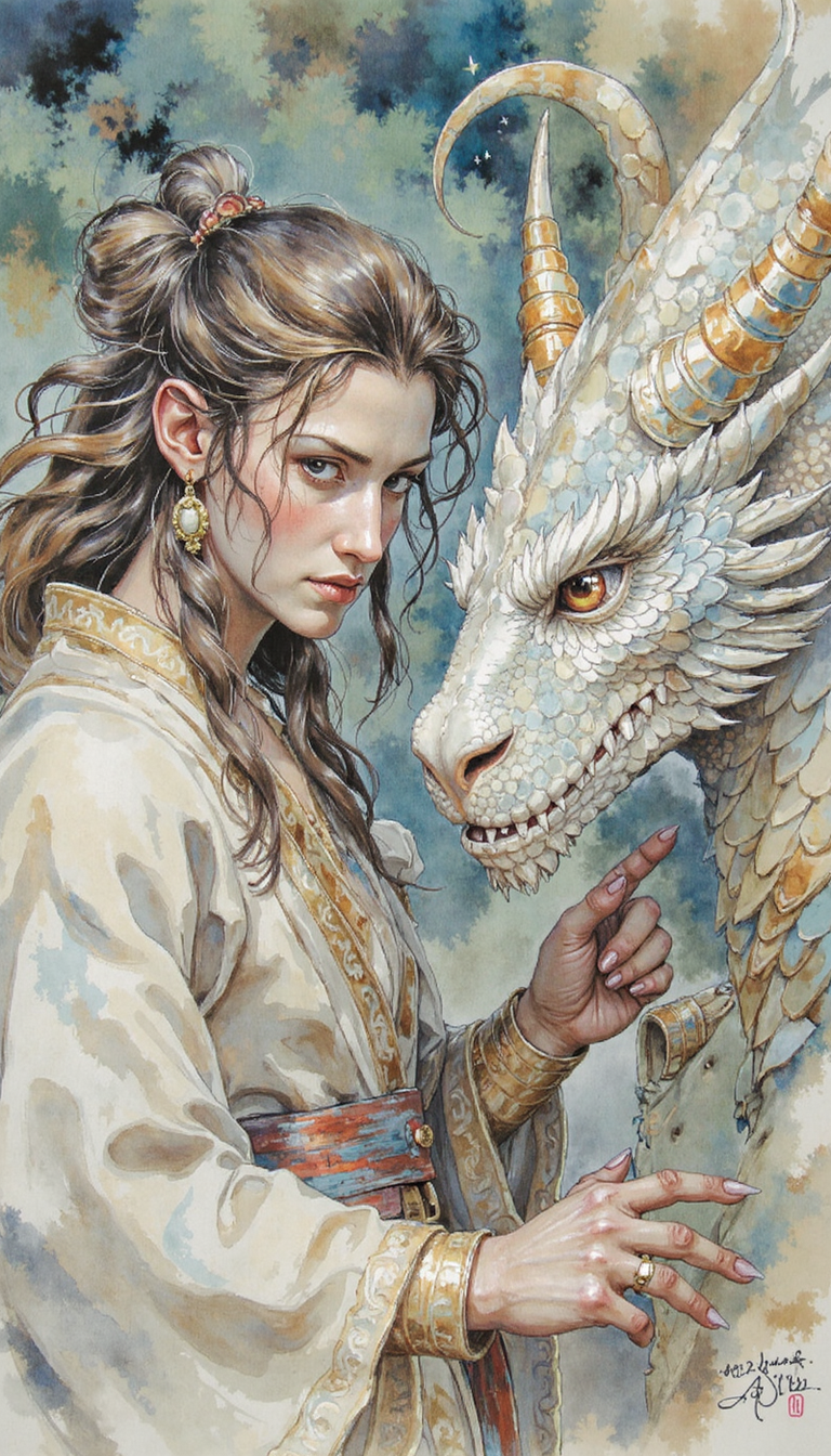 watercolor style,ARCHSLRA,a hand-drawn sketch and watercolor style,DRK, A luminescent, iridescent white dragon, rendered with hyperrealistic detail, fills the right side of the frame in a close-up shot. Capture the ethereal interaction as a young woman, adorned in diaphanous white robes, gazes into the dragon's eye. Bathe the scene in soft, ethereal light, emanating from behind the viewer, highlighting the pearlescent scales of the dragon and the delicate embroidery on the woman's gown. The background should dissolve into a dreamy, bokeh effect, hinting at a mystical forest setting. Evoke a sense of profound connection and ancient wisdom shared between the two figures.