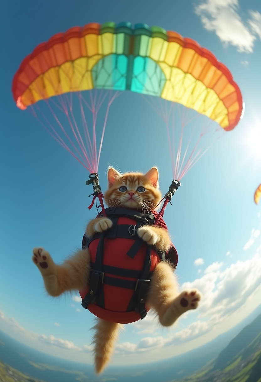 kitten paragliding, rainbow parachute, bottom-to-up angle view, view from below , low angle view, cinematic, movie still