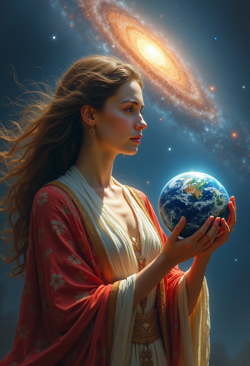 The female universe holds the earth in her hands. The galaxy can be seen in the background. Masterpiece, very detailed, midjourneyv6.1, detail background,