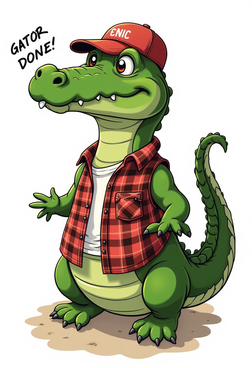 A cartoony alligator saying "Gator Done!", sleeveless flannel shirt, cap