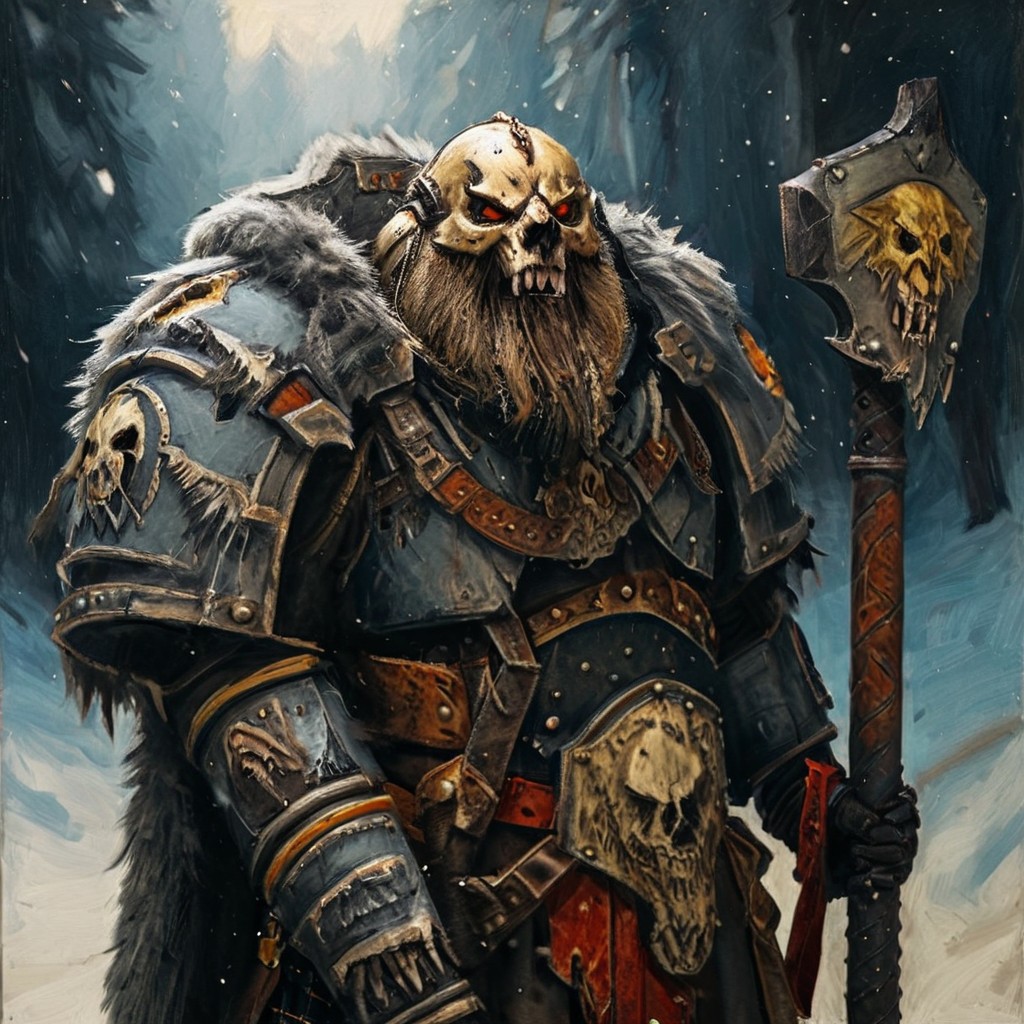 Space wolf warrior, wolf priest, chaplain, skull helmet, wolf skull helmet, wolf skull has a long snout that extends to the helmet mouth vent, the skull has fangs and glowing eyes, warrior with beard is in winter landscape, he is a werewolf space marine, he as heavy scars, he has his huge runic hammer in his hands, portrait style, viking, norse, beard, clad in ripped furs and pieces of old worn space wolf armor, Black over black, top light, masterful painting in the style of Anders Zorn | Marco Mazzoni | Yuri Ivanovich, Todd McFarlane, oil on canvas <lora:add-detail-xl:1> <lora:MJ52:0.5>