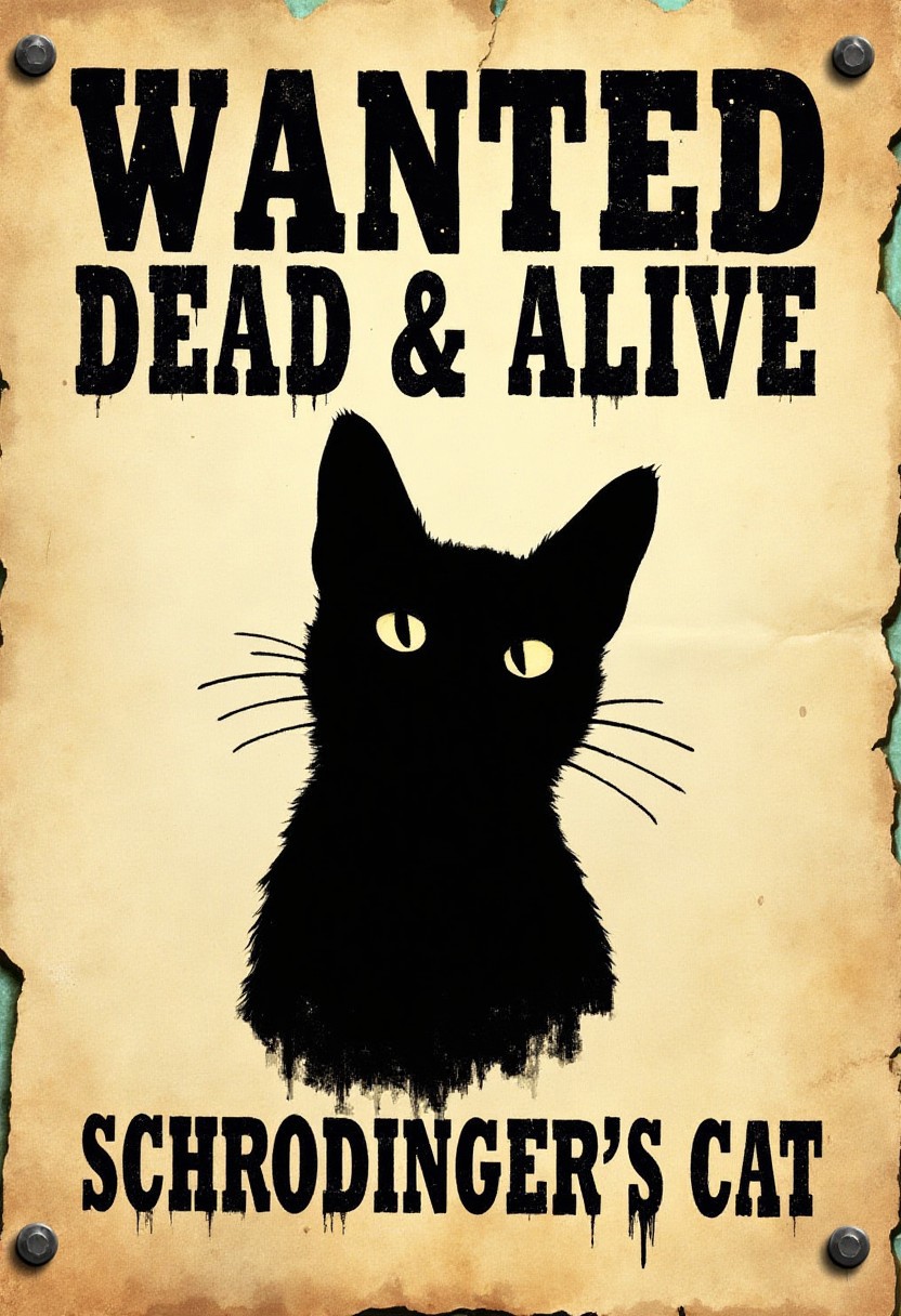 A stylized vintage 'wanted' poster with a rugged, weathered texture. The text at the top reads "WANTED" in large, bold, uppercase black letters. Below it, in slightly smaller text, it says "DEAD & ALIVE," with a distressed font. Under the text, there is a black silhouette of a cat's head with pointy ears, wide-open eyes, and sharp features. The cat's body is not fully visible, with the head being the central focus. At the bottom of the poster, in large bold letters, it reads "SCHRODINGER'S CAT" in a similar distressed black font. The entire poster has a torn paper appearance, with four visible metal rivets, one in each corner, securing it to a surface. The background is beige, adding to the worn, aged look. <lora:FluxDFaeTasticDetails:0.83> <lora:sxz-Dark-Fantasy-v2-Flux:0.66> drkfnts style,