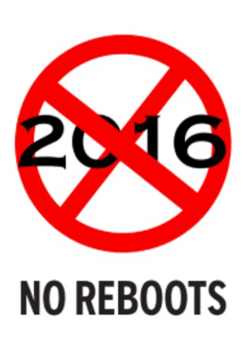 This is a digital graphic image featuring a vector symbol of the number “(2016)”. Overlaying the number is a bold, red circle with a slash in the middle, symbolizing prohibition or warning. The text below reads "NO REBOOTS!"