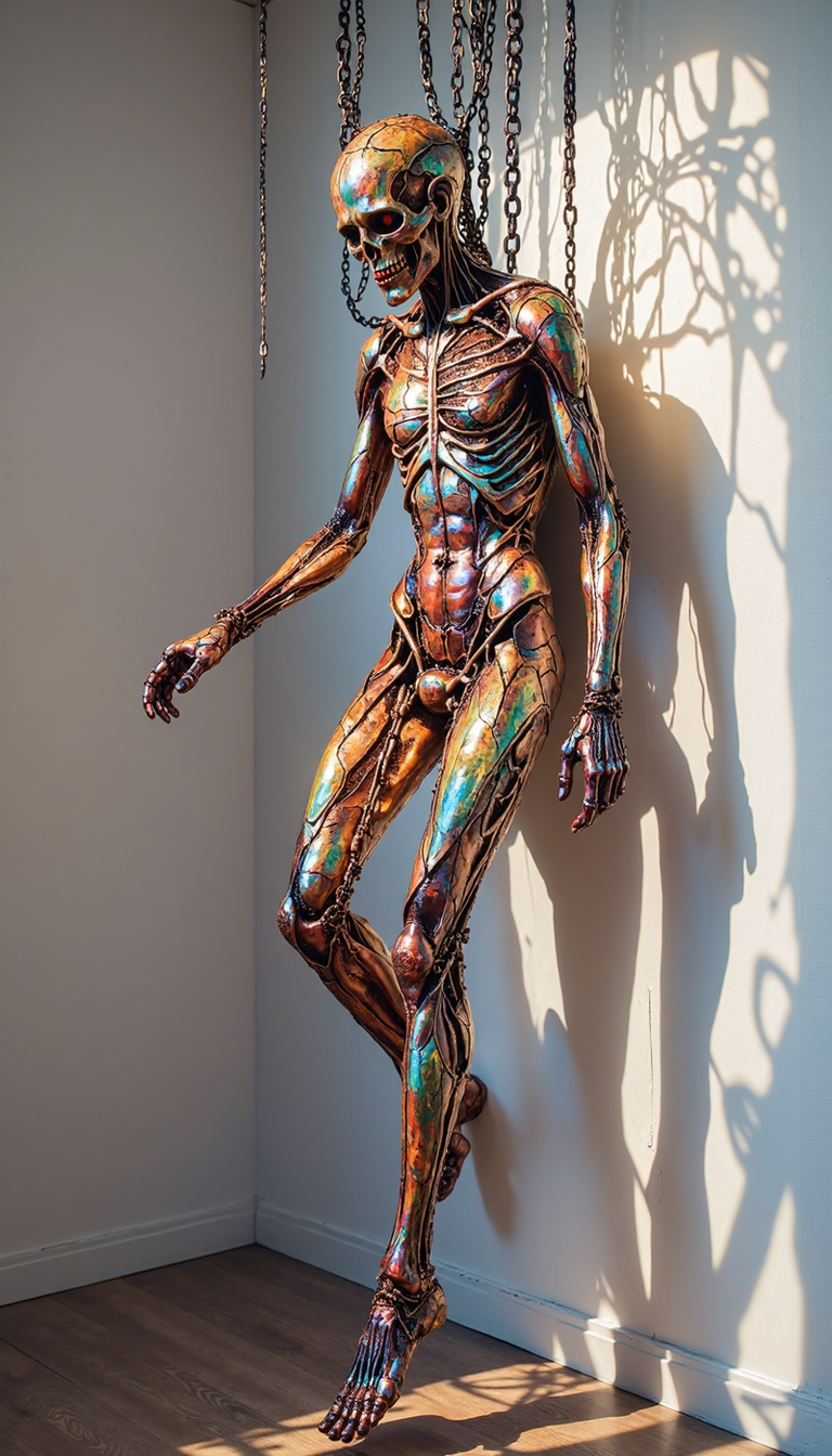 Bioluminescent,evangsurreal,surrealism,glitter, A photo of a sculpture depicting an emaciated figure, crafted from a terracotta-hued material with visible cracks and fissures, evoking a sense of fragility and decay. The figure is suspended against a stark white wall, its limbs contorted in a paroxysm of anguish, reaching out with elongated, splayed fingers as if clawing for escape. A network of sinuous black metal rods, reminiscent of skeletal scaffolding, supports the figure, further amplifying the macabre aesthetic. Chains with circular links, cold and industrial in their precision, are juxtaposed against the organic form of the sculpture, casting a web of shadows that dance ominously on the wall behind, hinting at confinement and struggle. The image should be captured in a chiaroscuro style, with dramatic, raking light emphasizing the figure's gauntness and the texture of the materials, while leaving the background in relative obscurity. The composition should be a medium shot, taken from a slightly low angle to enhance the sensation of the figure's desperate plea. The focus should be razor-sharp on the sculpture's outstretched hand and anguished face, leaving the surrounding details, such as the floor and lower portion of the wall, slightly out of focus to draw the viewer's eye upwards. Consider adding subtle dust motes, caught in the beam of light, to infuse the scene with a palpable sense of stillness and suspended time.