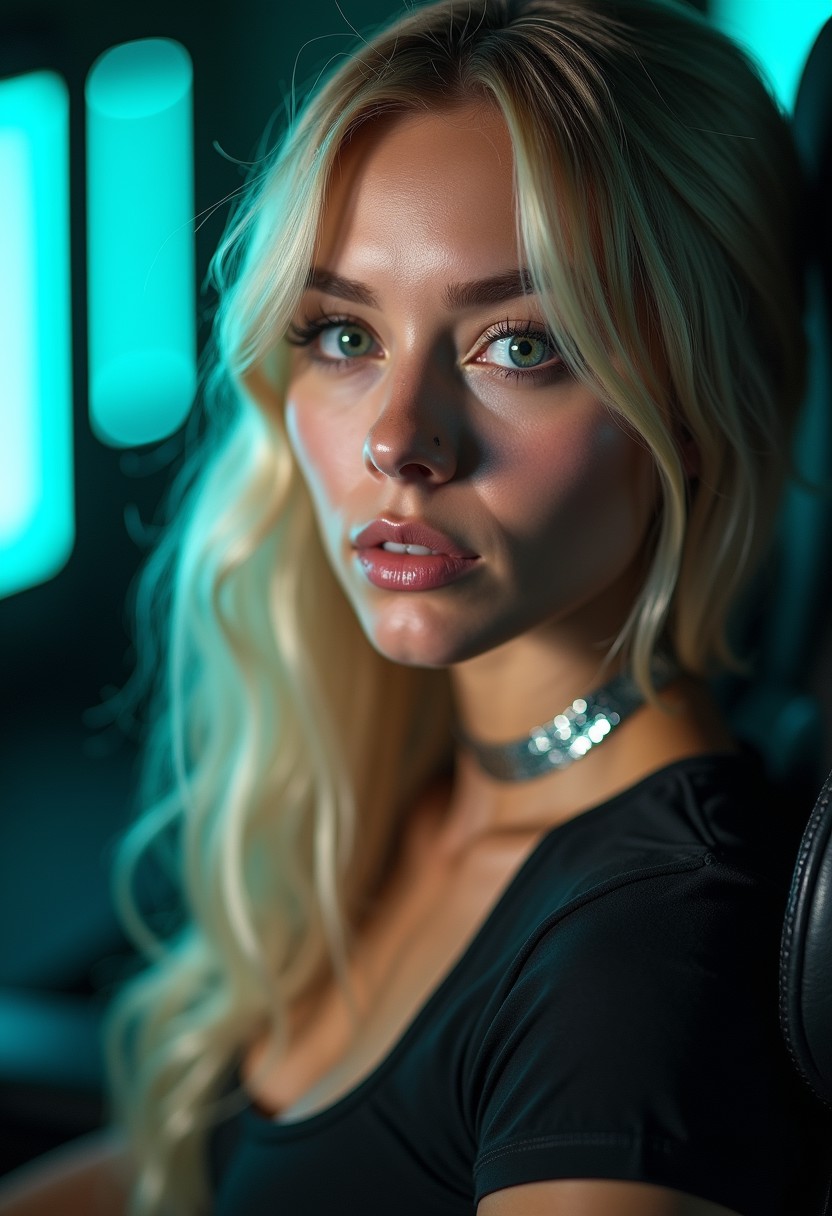 (ultra realistic,32k, ultra sharp,masterpiece:1.2),(high detailed skin:1.1),( high quality:1.1),(ultra high res:1.4), (beautiful lighting:1.4), (dynamic angle:1.6); close-up portrait of a woman with long blonde hair and striking green eyes, sitting in a gaming chair. She wears a black top and a shiny metallic choker, highlighting her features. The background is softly lit with a bluish-green glow, creating a vibrant, modern atmosphere. Her expression is serious and focused, with a slight shine on her lips.