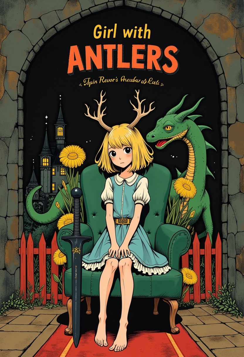 style of John Kenn Mortensen. The cover of the book \"Girl with Antlers\" by Andre of Astora. The cover is a vibrant black with a village in the center of the cover. The text \"Great journey\" is written in a bold orange font above the castle. Dark fantasy anime style.\nthe book \"irl with Antlers\" on a table with a detailed cover image . title text \"Girl with Antlers \".\" An animated image of a girl with blonde hair and antlers on her head. She is sitting on a green chair with her legs crossed. The girl is wearing a blue dress with a white stripe down the front. Her legs are crossed over her body. Her arms are crossed in front of her and her legs are bent at the knees. Her dress is a light blue color with a gold belt around her waist. Her feet are barefoot and she is holding a black sword in her right hand. Her left hand is raised in the air. Her right hand is resting on her hip. The sword is black with gold writing on it. To the right of the girl is a green dragon. The dragon is surrounded by a red fence. The fence is made of wood. There are yellow flowers on the left and right sides of the image. background behind the dragon.\ book cover