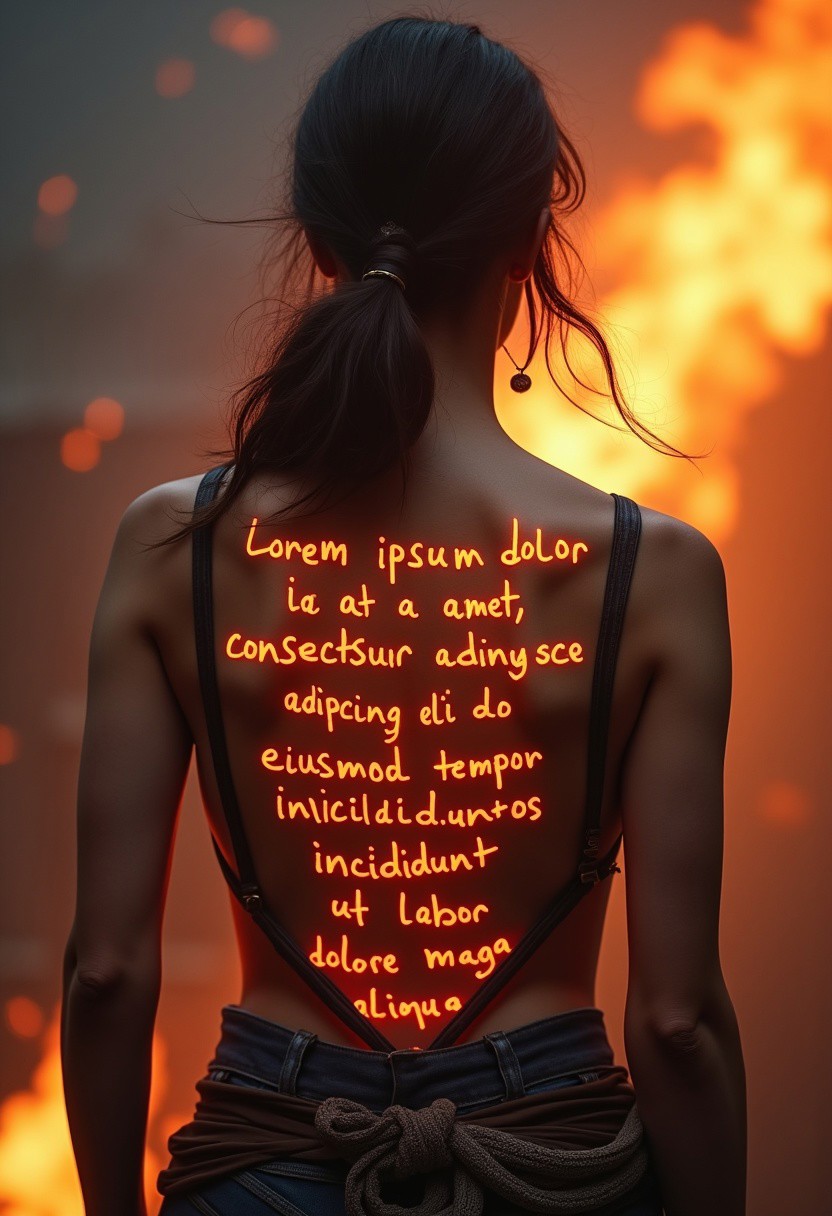 rear view of a warrior girl, her back exposed, written in her back the mantra "Lorem ipsum dolor sit amet, consectetur adipiscing elit, sed do eiusmod tempor incididunt ut labore et dolore magna aliqua" written with fiery words, dramatic setting