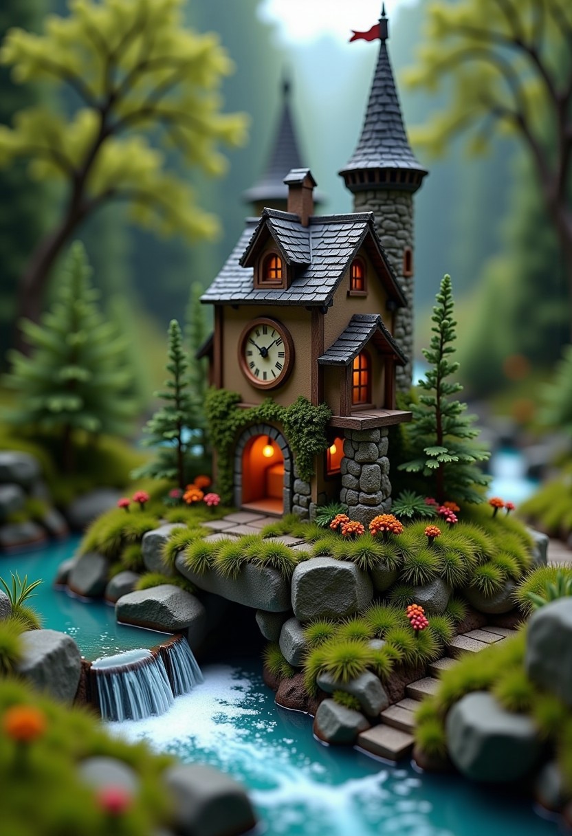 best quality, miniature diorama showcasing a charming elaborate clocktower with whimsical elements, magical fairytale landscape, fantasy style art, intricate details, ultra sharp, exquisite detail, flawless composition, vivid colors, masterpiece, exciting background, realistic, realism