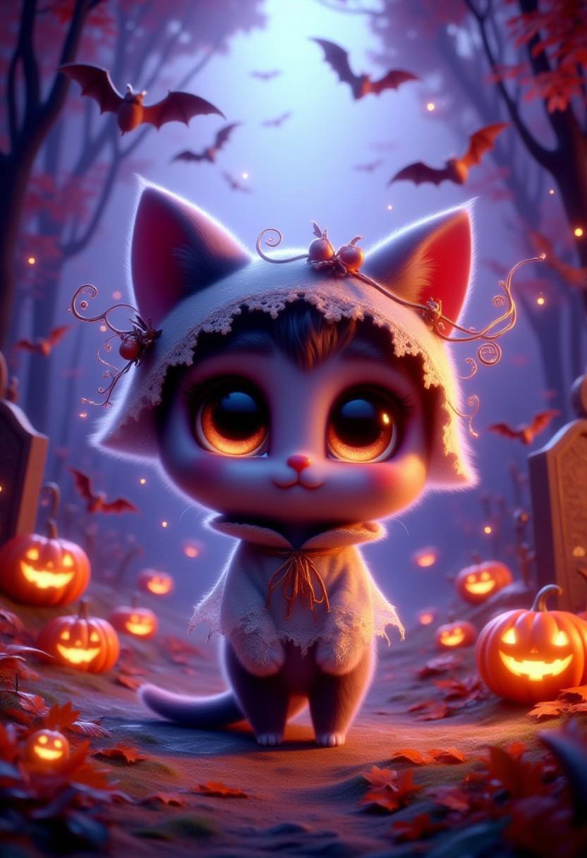 pinkchibihalloween, A cute chibi cat stands in an enchanted, whimsical autumn forest. Her small, round figure wears a cute mummy disguise with tattered lace around the edges. It is decorated with glowing pumpkins and twisted vines. Her big, expressive eyes and rosy cheeks make her look both mischievous and innocent. Her chibi curls with a few ghostly white strands peek out from under her hat. All around her, friendly bats with glowing eyes flutter through the dark, spooky trees. Her eerie appearance is softened by the magical atmosphere. In the background, a soft-focus cemetery scene adds misty shadows and playful moonlight. Cheerful jack-o-lanterns with glowing smiles light up the scene while the air is filled with magical dust. The overall mood is whimsical, blending dark purple, orange, and blue tones into a sweet Halloween-style fantasy.