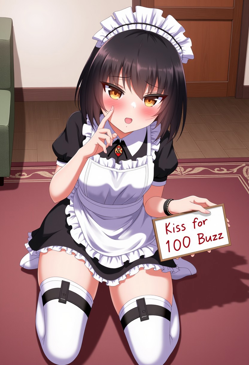 in the style of m-da_s-tarou, A beautiful woman kneeling on the ground of a living room. She has short black hair styled in a bob cut, amber eyes, and appears to be wearing a maid uniform with thighhighs and a maid headdress. The woman is crying while facing the viewer, holding a sign that says "Kiss for 100 Buzz", An illustration in the style of m-da_s-tarou