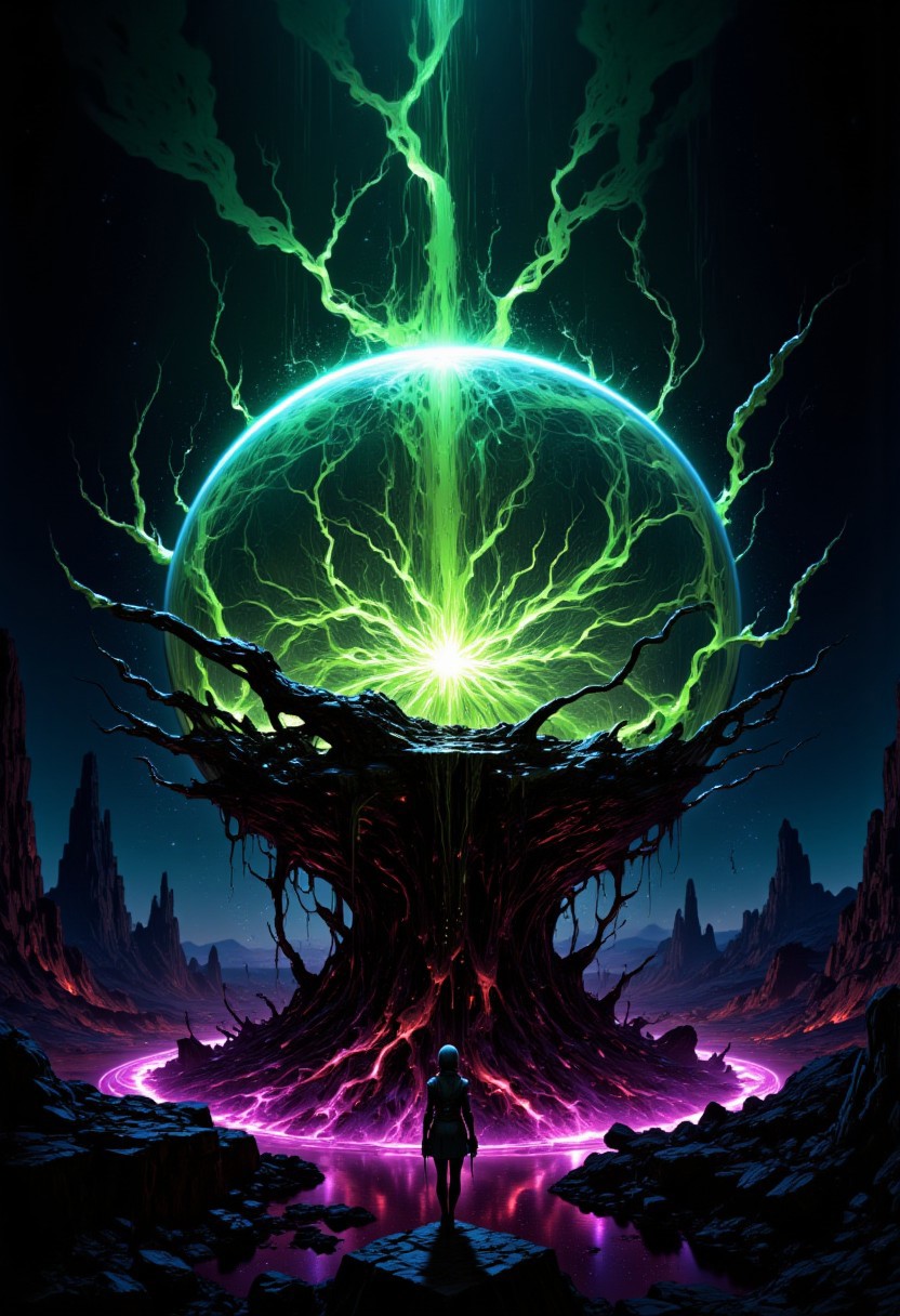 A hyper-realistic scene of a floating, giant crystal orb, glowing with inner green light. The orb is suspended above a black void, surrounded by swirling tendrils of energy, which pulsate with vivid neon hues of purple, green, and pink. Inside the orb, intricate geometric patterns shift and morph, creating a mesmerizing kaleidoscope effect. The scene is set in complete darkness, with only the glowing orb and tendrils illuminating the space. The atmosphere is otherworldly and enigmatic, capturing a sense of cosmic power and mystery. <lora:FluxMythP0rtr4itStyle:0.8> MythP0rt, <lora:aidmaImageUpgrader-FLUX-V0.1:0.33> detailmaximizer, <lora:artilands:0.66>