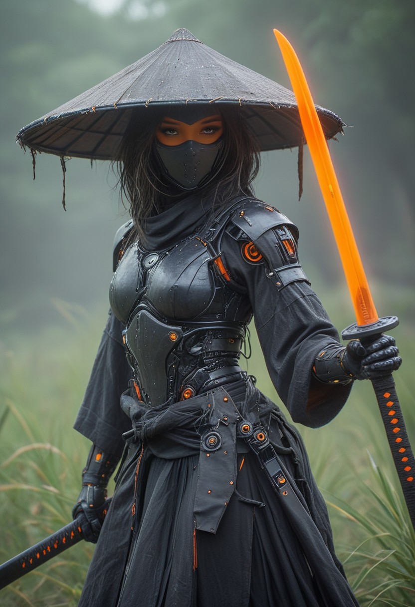 Craft a captivating vibrant dark black-neon caption for a photo capturing the essence of a cyborg Bedouin sorceress in fight stance, defying expectations by conjuring a whimsical robot 'freak' from an oversized sedge hat. ethereal, smoky backdrop. throwing a translucent orange/tanslucent purple/black iaidow, weapon, katana, holding sword, ready to draw, sheathed, unsheathing, scabbard,, very detailed, atmospheric haze, Film grain, cinematic film still, shallow depth of field, highly detailed, high budget, cinemascope, moody, epic, OverallDetail, gorgeous, 2000s vintage RAW photo, photorealistic, candid camera, color graded cinematic, eye catchlights, atmospheric lighting, skin pores, imperfections, natural, shallow dof