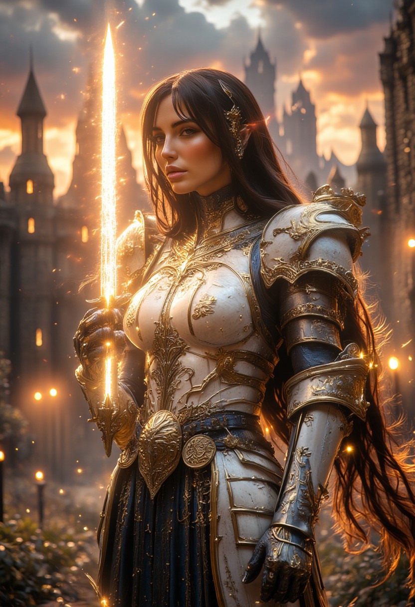 "In an awe-inspiring outdoor scene, a Female Brazilian knight stands tall and regal in front of a grand medieval castle, its stone towers silhouetted against a breathtaking sunset. The sky is ablaze with hues of orange, pink, and purple as the sun dips below the horizon, casting long shadows across the landscape. The knight, donned in gleaming armor adorned with intricate white and gold patterns, holds her legendary sword with both hands. The blade shimmers with ethereal rainbow light, reflecting the last rays of the day. Her dark hair, styled with soft bangs, frames her face, as she gazes thoughtfully at the sword. The soft, golden sunlight filters through the clouds, illuminating the detailed craftsmanship of her armor. The entire atmosphere is bathed in a warm, cinematic glow, evoking the mood of an epic dark fantasy, where strength and serenity converge in a moment of perfect stillness."