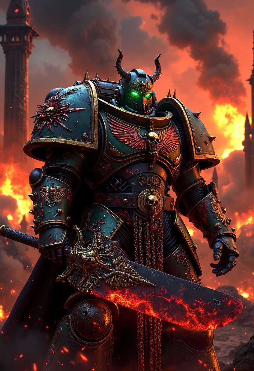 A Chaos Space Marine in full battle armor, standing amidst a war-torn battlefield. His armor is an intricate fusion of ancient, corrupted metal and twisted organic growths, glowing with chaotic energy. The armor plates are etched with unholy runes, and dark, crimson blood oozes from the cracks, pulsating with an eerie light. Wickedly sharp spikes and jagged chains adorn his shoulders and gauntlets, while a massive, barbed power axe crackles with red lightning in his hand. In the background, colossal ruins burn under a blood-red sky, as black smoke rises, illuminated by sporadic explosions. Faint echoes of demonic whispers fill the air. The scene is lit with harsh, dynamic lighting that casts deep shadows and highlights the metallic sheen and organic textures of his armor. The glowing eyes of the Chaos Space Marine pierce through the darkness, emanating an unsettling, otherworldly green glow. The atmosphere is thick with fog and drifting ash, creating an intense, apocalyptic mood. Photorealistic, 8K resolution, hyper-detailed, cinematic composition.