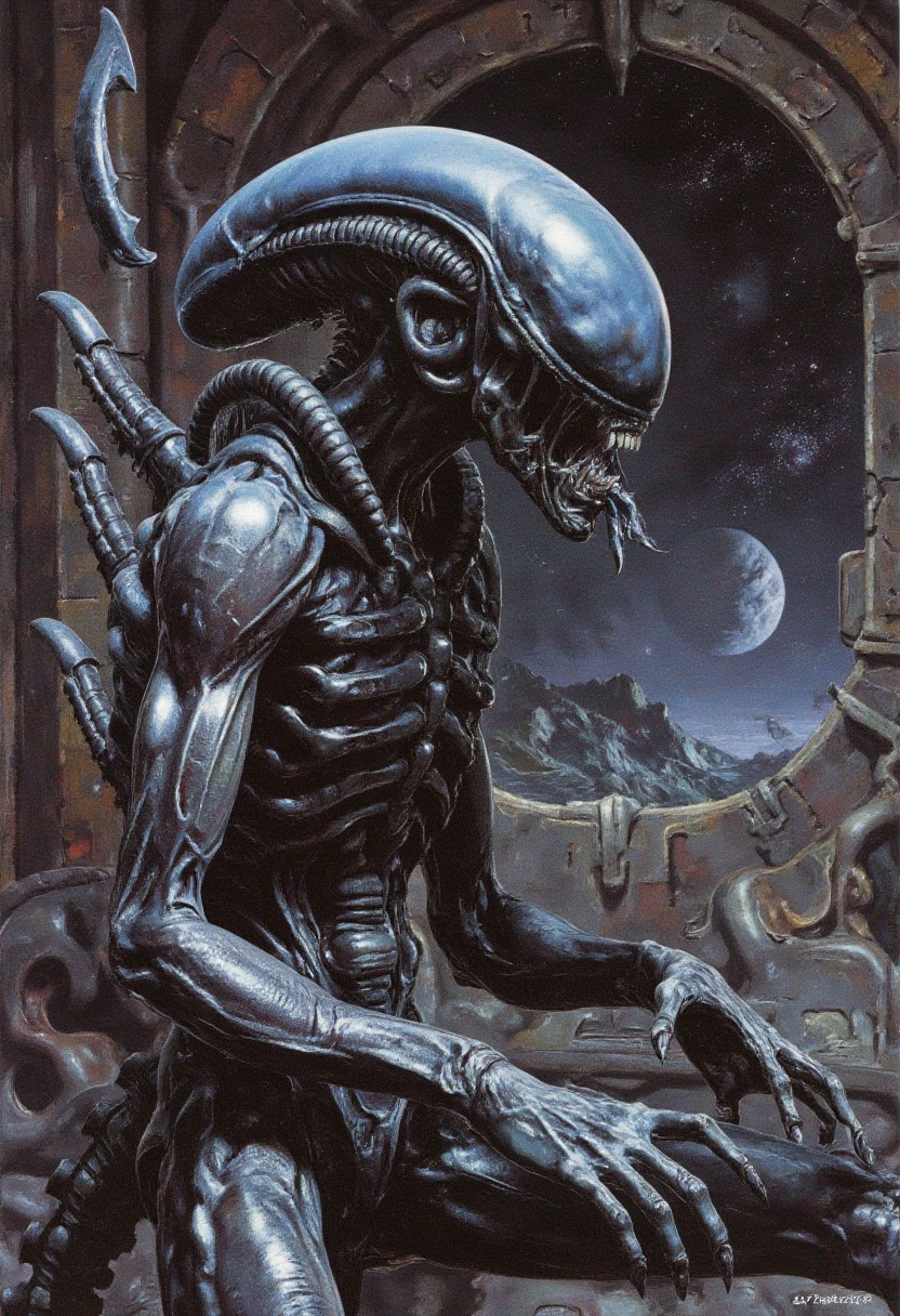 Frank Frazetta fantasy oil painting upper body portrait of a alien xenomorph, retro futuristic sci-fi space station background, window showing stars and planets