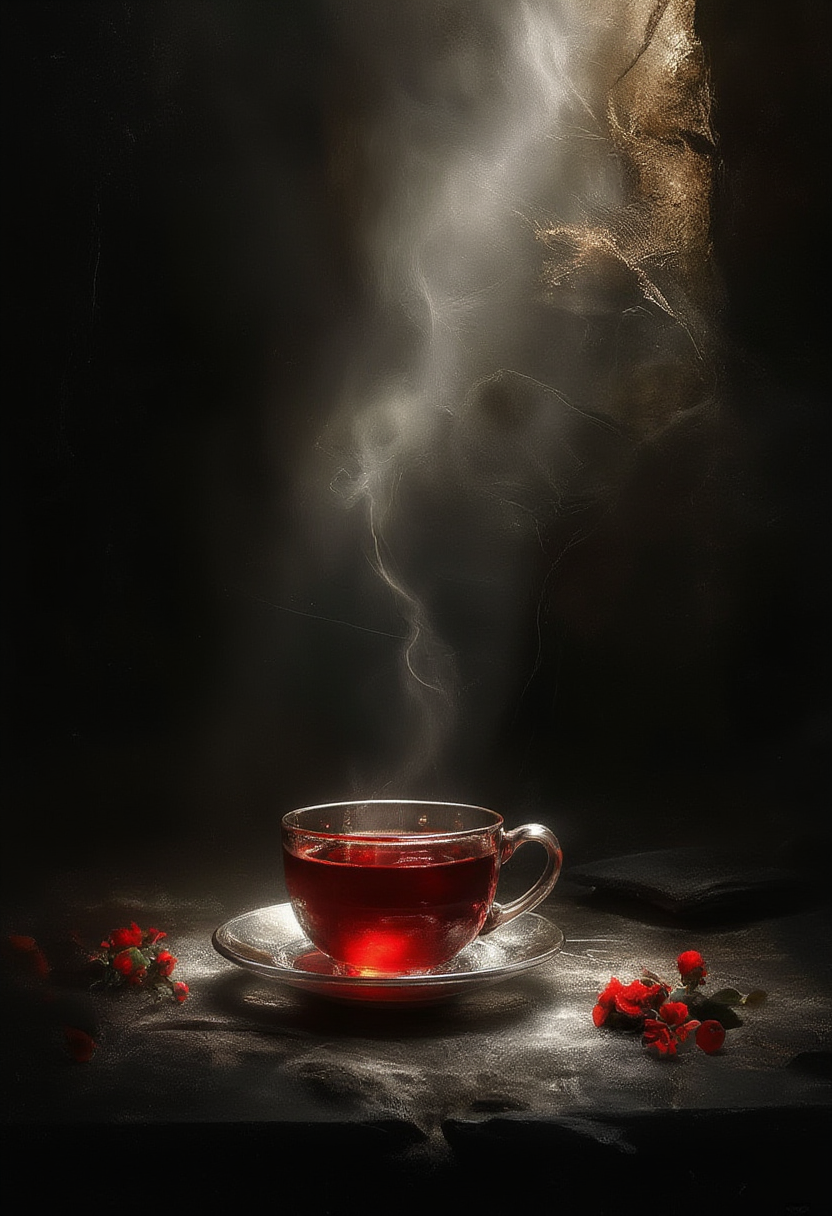 Elegance and darkness. The image features a cup of tea, which is the focal point, artfully positioned at the center of the composition. The tea is rendered in vivid red tones, reflecting the rich color palette of the Dutch Golden Age painting style. The background is dark, desaturated, and filtered with a grunge texture to evoke a sense of nostalgia and decay. The desaturation creates a contrasting effect with the bright tea, emphasizing its presence. The lighting is set to a hard light, creating strong shadows and highlights that add depth to the image. The overall style of the image is inspired by the work of American pop artist Roy Lichtenstein, known for his use of bold colors, and distorted imagery. light beam, ,<lora:Magic of Art (FLUX).safetensors:1.0> ,.safetensors: ,1.0 ,>