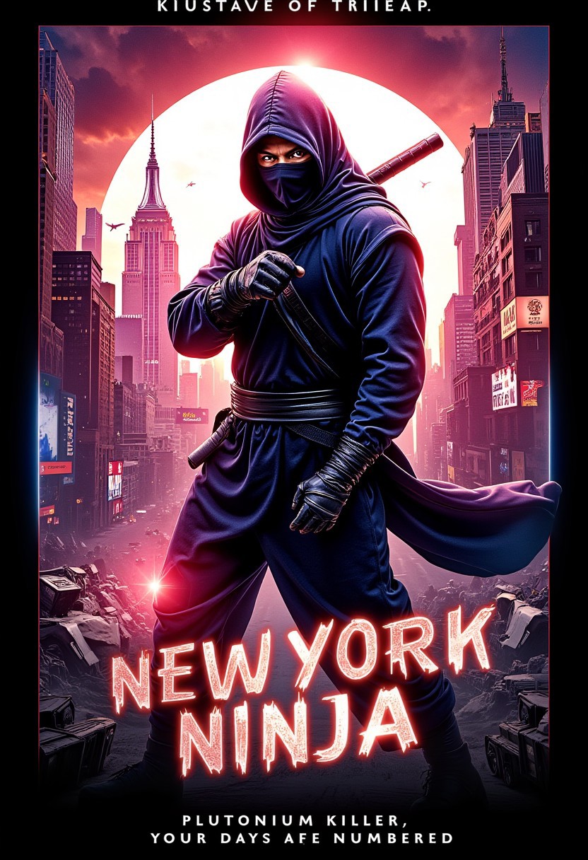 Poster Title "New York Ninja", text title style, perfect text title A mysterious, martial arts expert, clad in a sleek ninja suit. Background: A neon-lit, futuristic New York Cityscape, with a Bronze, Liquid Crystal, and Holographic Haze Backdrop. Supporting characters: None, but the silhouette of the villainous Plutonium Killer looms in the shadows. Branding type: Cyberpunk, 8k, inspired by Yoji Shinkawa's art style. Tagline: "Plutonium Killer, your days are numbered!" Visual style: A fusion of Grunge and Hot Wax Painting aesthetics, with bold, Beige and Mauve hues, and a Prism Effect, evoking a sense of high-tech danger.