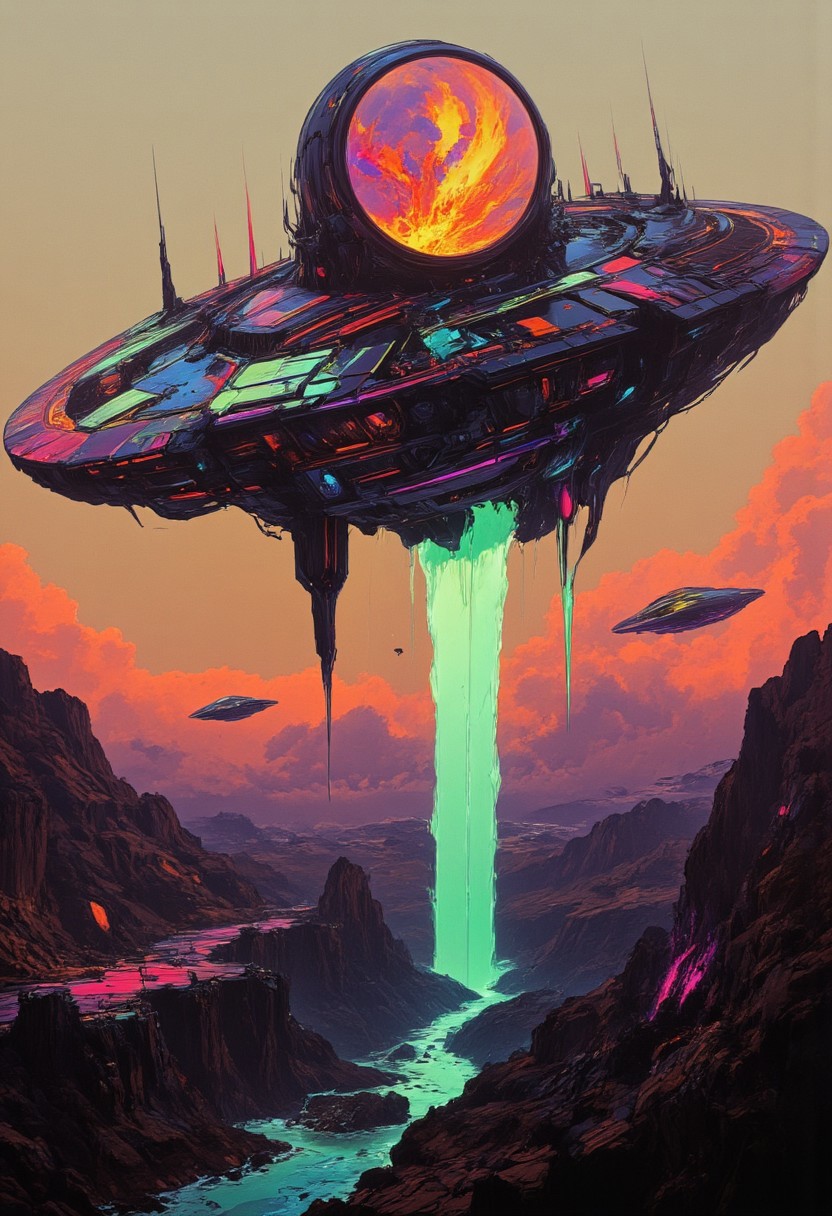 flat color two toned in translucent Neon Pink, Blue and Green hues, cinematic lighting, insane details, hyperrealistic extreme closeup macro photography, 64 megapixel DSLRAn intense action-packed anime scene in a sketch-like style, featuring thick, bold lines with a vibrant translucent color palette. This is a CGI-rendered image depicting a scene of UFOs, or extraterrestrial spacecraft, floating in a gradient sky. The sky transitions from a warm, soft orange hue at the bottom to a pale, muted blue at the top. The UFOs are uniformly designed with a sleek, metallic appearance, featuring rounded, saucer shapes with a slight dome on top. They are evenly spaced out in the sky, creating a sense of depth. Each UFO has a ring of small, circular lights around the edge, which are illuminated, giving them a glowing effect. The UFOs are positioned at varying distances, some closer to the horizon and some more distant, creating a sense of depth and perspective. The overall atmosphere of the scene is eerie and somewhat mysterious, invoking a sense of awe and wonder, typical of the UFO phenomenon., ethereal, atmospheric haze, emphasizing the powerful contrast between light and darkness. The atmosphere is filled with raw intensity as a fierce aura envelops the subject, reflecting the growing, monstrous anger. The aura swirls violently, as if ready to explode. The use of deep blacks highlights the raw emotion and energy in this high-detailed, sketch-like artwork.