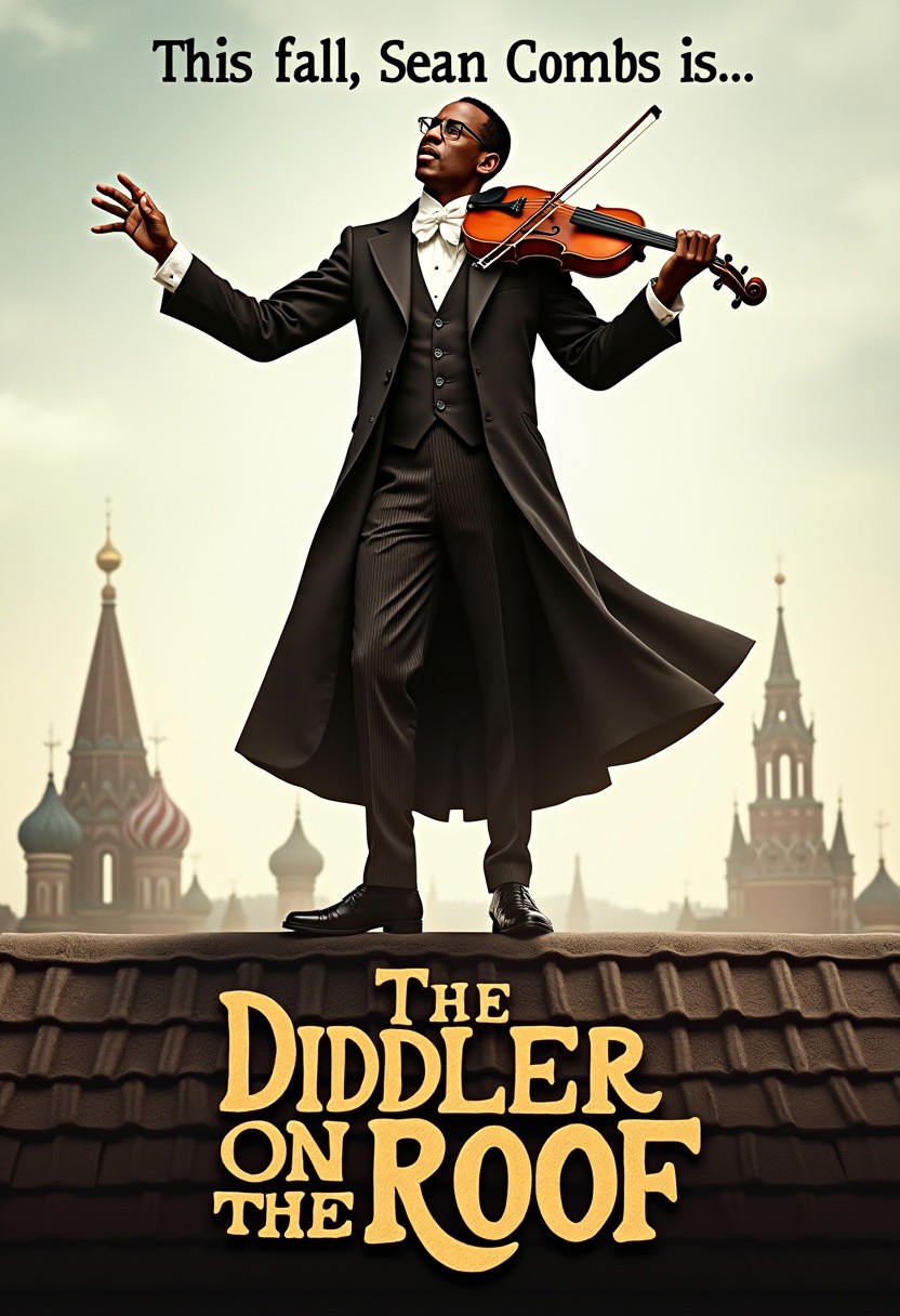 A movie poster featuring P. Diddy dancing on a roof with a fiddle dressed in clothes from the early 1900s era of Russia. The top portion of the poster will read: "This fall, Sean Combs is..." And in the bottom section of the poster in a very large and pronounced font "The Diddler on the Roof"