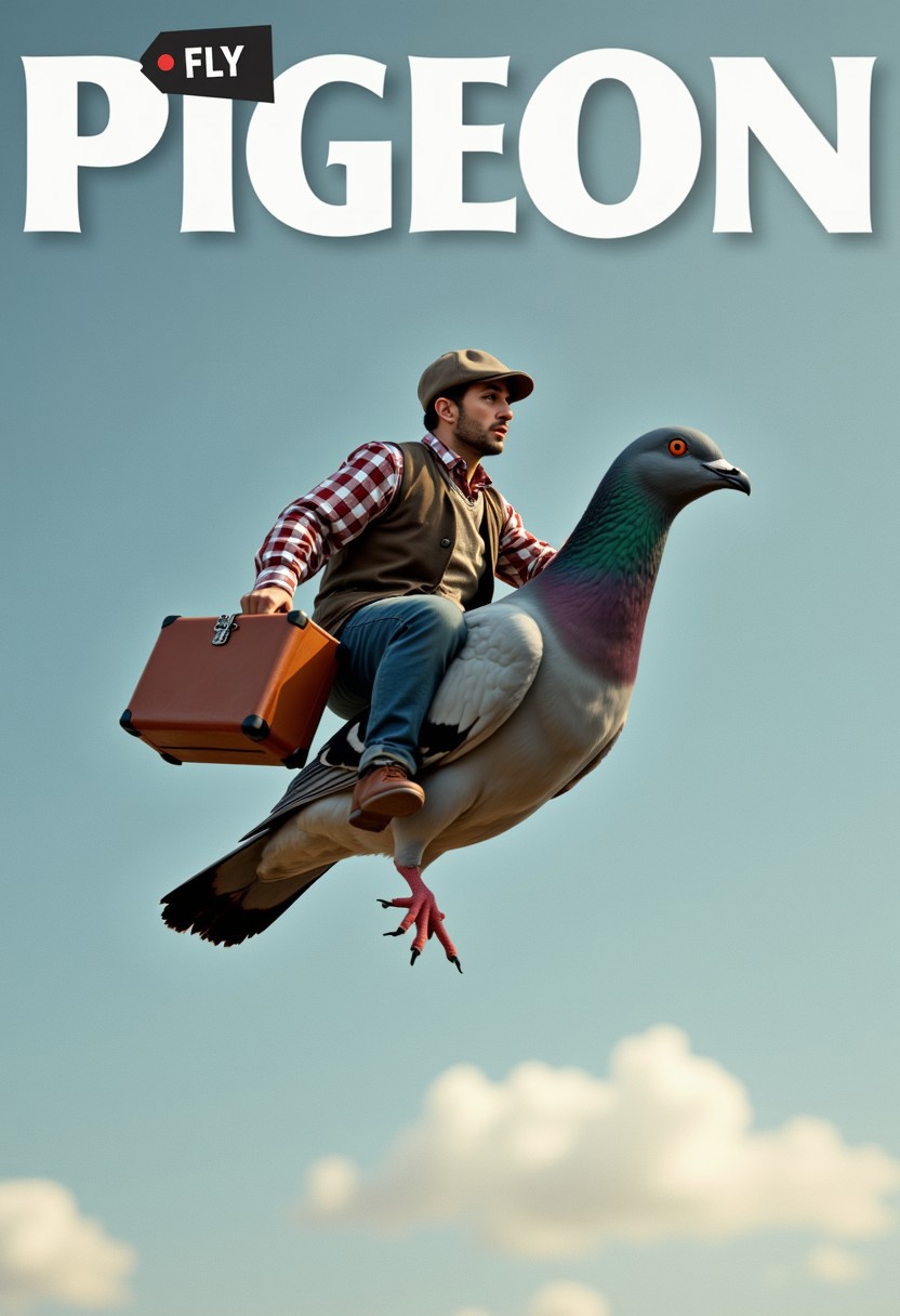 A miniature person Yorkshire man wearing flat cap, gingham shirt and fleece vest, carrying a suitcase, is riding on a normal sized pigeon like a horse as the pigeon flies through the sky. advertisement says in bold letters "FLY AIR PIGEON".