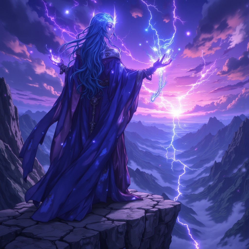 ArsMJStyle, ChiaroscuroFantasy, Grand Archmage in a Glowing Twilight, A powerful sorceress with flowing robes of dark blue and violet stands atop a soaring castle parapet at dusk, her eyes glowing so brightly with arcane energy that they resemble stars. Her face is absolutely gorgeous, as if she were the subject of Luis Royo's paintings. Her hair is a rich blue that catches the last rays of the sun, setting them to translucent vibrance, and her hands conjure floating violet orbs and runes of luminous power. Behind her, a vast landscape stretches out, with dark mountains illuminated by the fading sun and the first stars beginning to twinkle in the sky. A dramatic lightning bolt splits the sky. The soft light casts long shadows, accentuating the dramatic scenery.