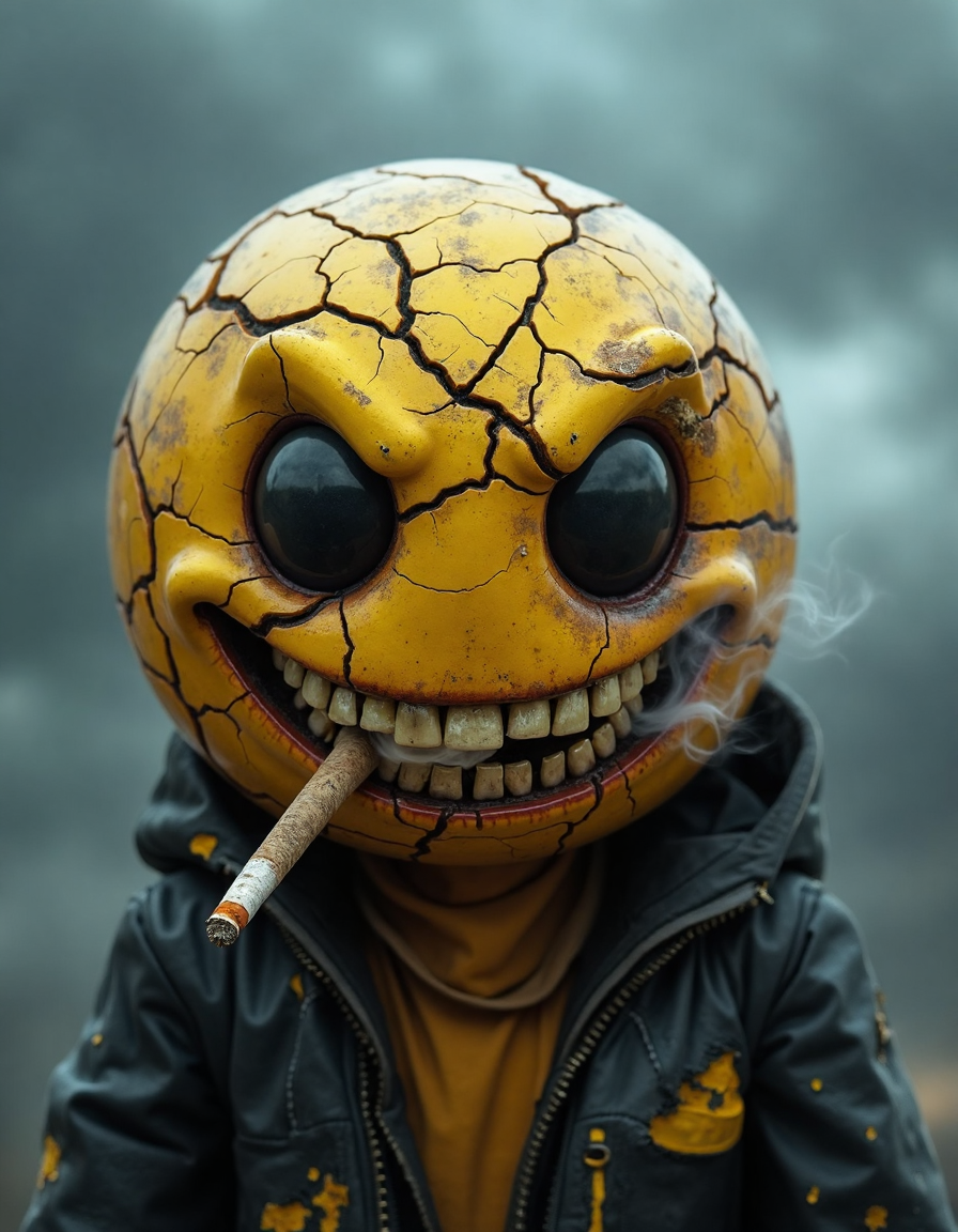 closeup, A cracked, yellow smiley face with a menacing grin. large black eyes and big teeth expose a decayed, sinister look. A lit cigarette dangles from its lips, smoke curling ominously. The black, torn jacket with yellow accents adds to its gritty aesthetic. while a stormy sky looms overhead, enhancing the dark, unsettling atmosphere