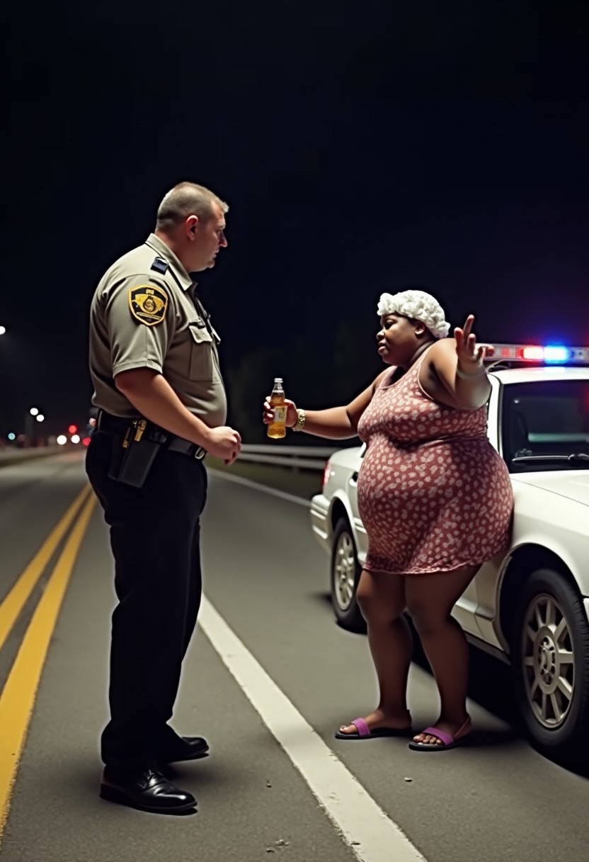 An incredibly fat ugly african american woman wearing a shower cap has been pulled over by a police officer and is on the side of a highway performing a sobriety test. The woman is facing a viewer with its arms outstretched, holding a beer, but is falling over. The police officer looks at the woman with disappointment. It is night time. The police car has flashing sirens. The caption reads “Popped!”