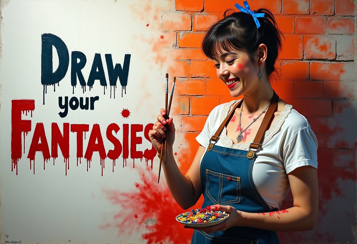 poster of the drawing school, realistic style, on the right of the poster is a woman walker with a crazy smile, 40 years old, sexy, lush short hair fixed with a blue ribbon, apron, shirt with a painful neckline, brushes and paints for drawing in her hands, the whole body in the frame, face and shirt are heavily stained with paints, the background is a brick wall stained with paint, on the left is a large slogan: "Draw your FANTASIES", at the bottom is the text: "School of Folk Art", bright colors, masterpiece, spectacular lighting, maximum quality, maximum detail