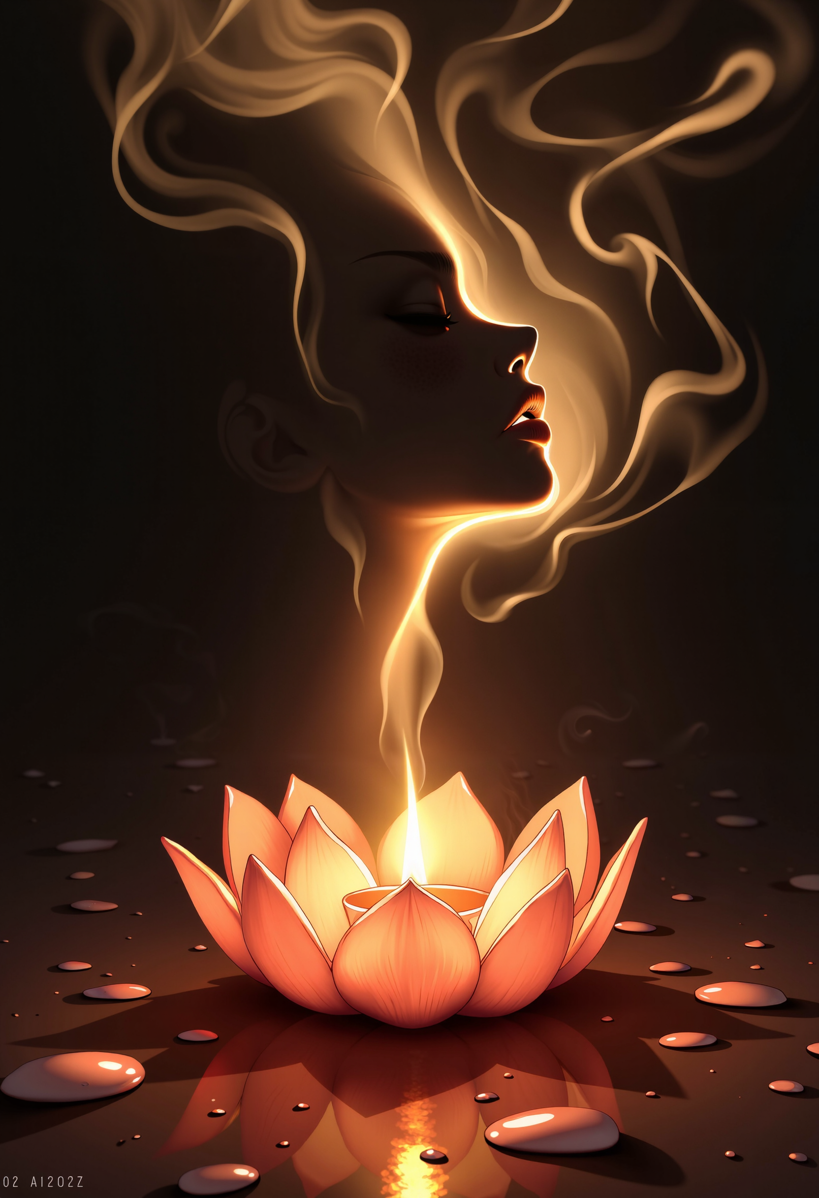 detailmaximizer,anime_martz, In the midst of a secret religious ceremony, a lotus-shaped candle burns softly on the floor. From the flickering flame, delicate streams of smoke rise, slowly swirling and merging to form the ethereal soft silhouette of beautiful faceless profile of a woman. The smoke doesn't capture specific details but instead outlines her graceful side face, creating a dreamy, mysterious atmosphere. The soft, flowing lines of the smoke contrast with the solid form of the lotus candle, blending the real with the abstract. The warm, gentle light from the candle adds depth to the scene, casting subtle shadows and enhancing the surreal, otherworldly feeling of the floating silhouette